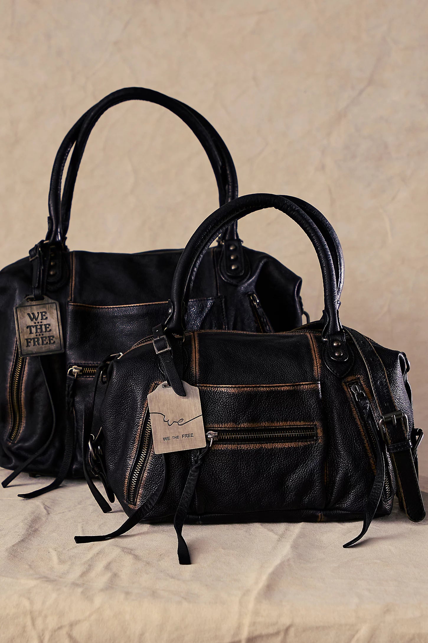 Features: Vintage-inspired leather fabrication, two carrying straps, adjustable and detachable shoulder strap, main zip entry, exterior zip pockets, interior zip pocket, leather pull tabs, logo embossed tag
