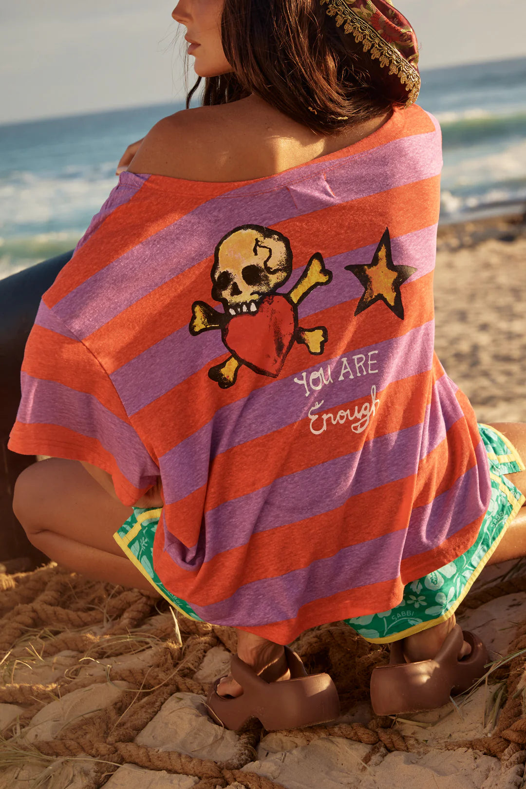 The Bad to the Bone Striped Off the Shoulder Tee is for the pirates who look tough but feel deeply. Washed red and purple stripes bring instant vintage energy, while hand-drawn tattoo-style graphics give it that perfectly worn-in, collected-on-your-journeys feel.