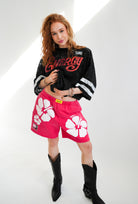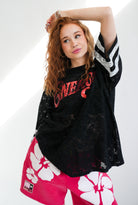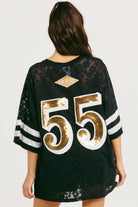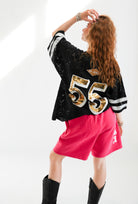 Made in a lightweight lace with an oversized fit, this tee brings the perfect mix of streetwear and party-girl chaos. The bold sequin lettering across the front brings the drama, while the mega 55 sequin back graphic makes sure, you're unforgettable from every angle. Wear it over a cute bralette, a bikini or a cami if you're feeling mums picking me up vibes.