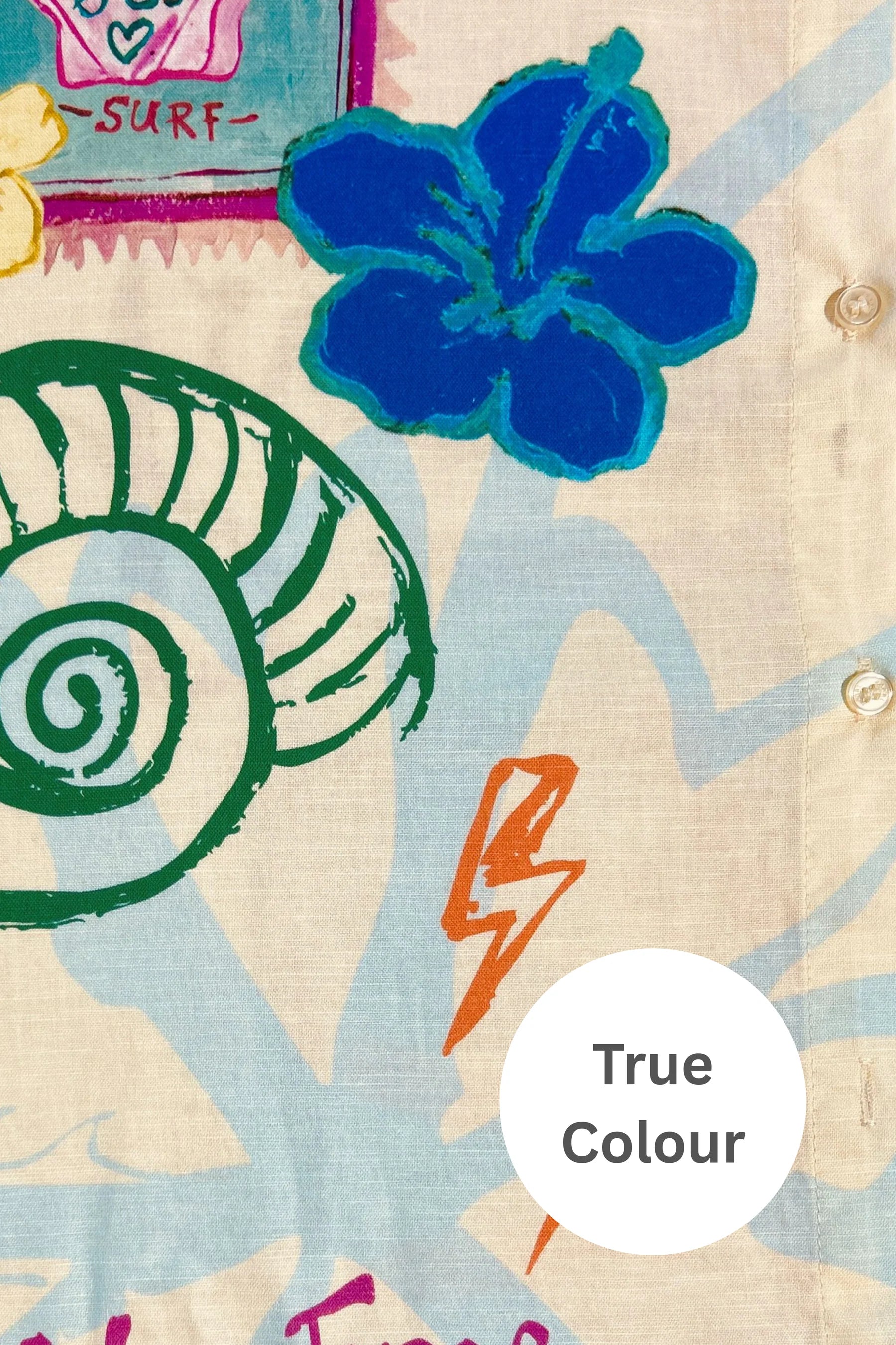 Featuring bold, hand-drawn Seas The Day artwork across the fabric, this long sleeve button-up brings together mermaids, shells, suns and scribbled details in true Sabbi style. Cut in an easy, loose fit and crafted from a lightweight, breathable fabric, its perfect worn open, softly buttoned or thrown on when the sun dips.