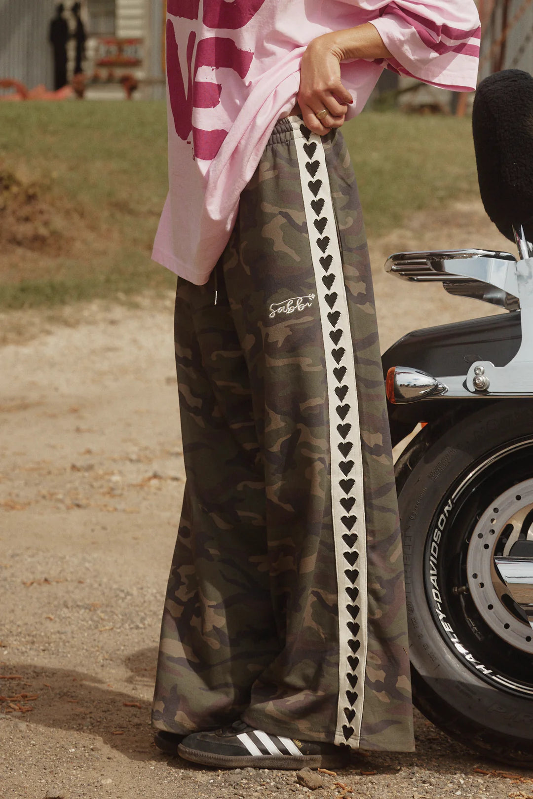 Featuring an extra wide relaxed leg, woven heart tape down side legs, side pockets, a cute Sabbi leg embroidery and thick elasticated waistband with draw string.