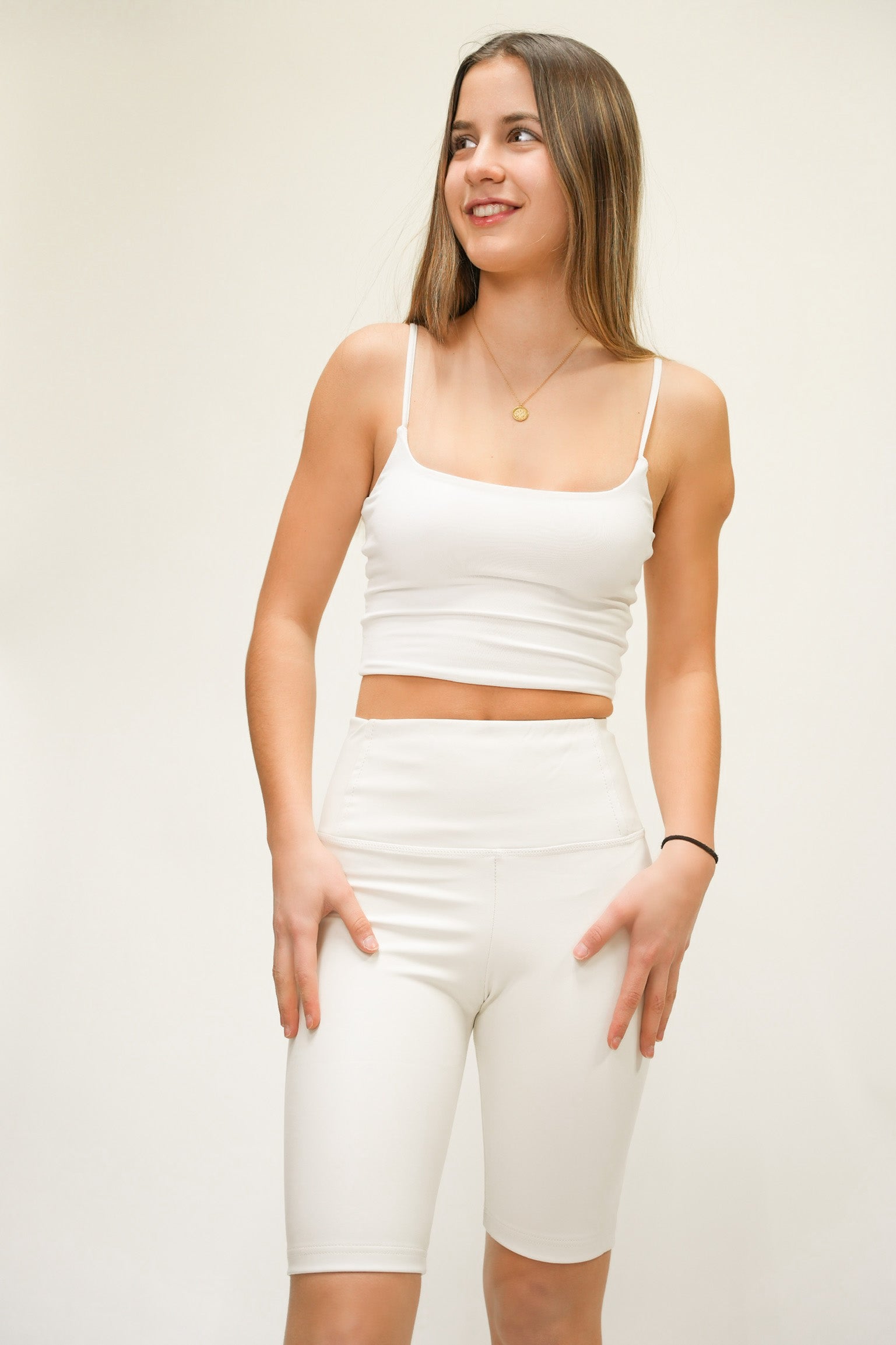 Detail: Faux leather bike short, mid thigh or just above knee cap