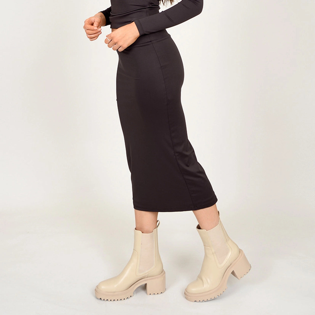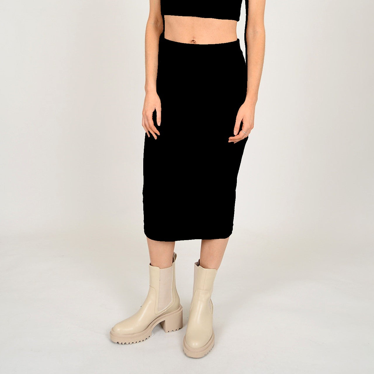 Detail: Black midi skirt, elastic waistband, double-layered fabric, high stretch technology, buttery soft feel.