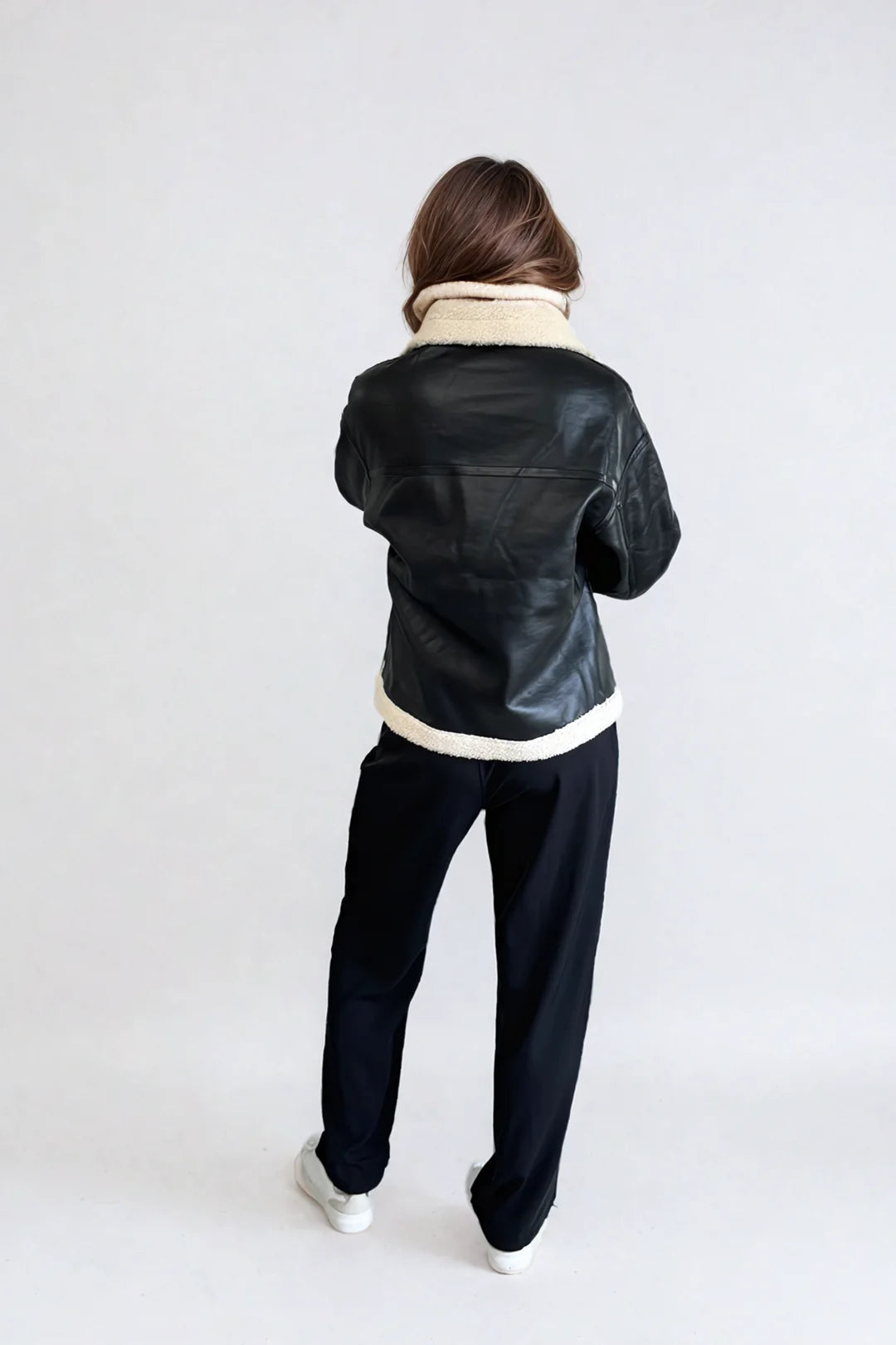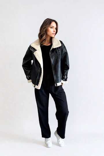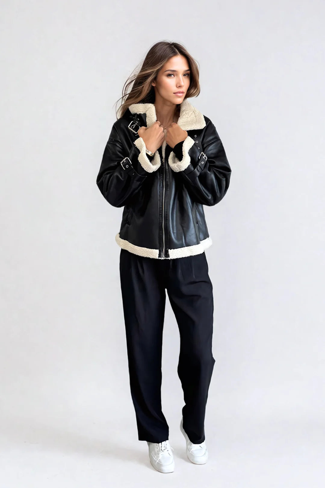 Get ready to rev up your style with the Ramone Moto Inspired Coat. Made from vegan leather, this coat features a cool moto-inspired design with buckle details and a cozy fuzzy inside. Take your look to the next level while staying warm and fashionable.