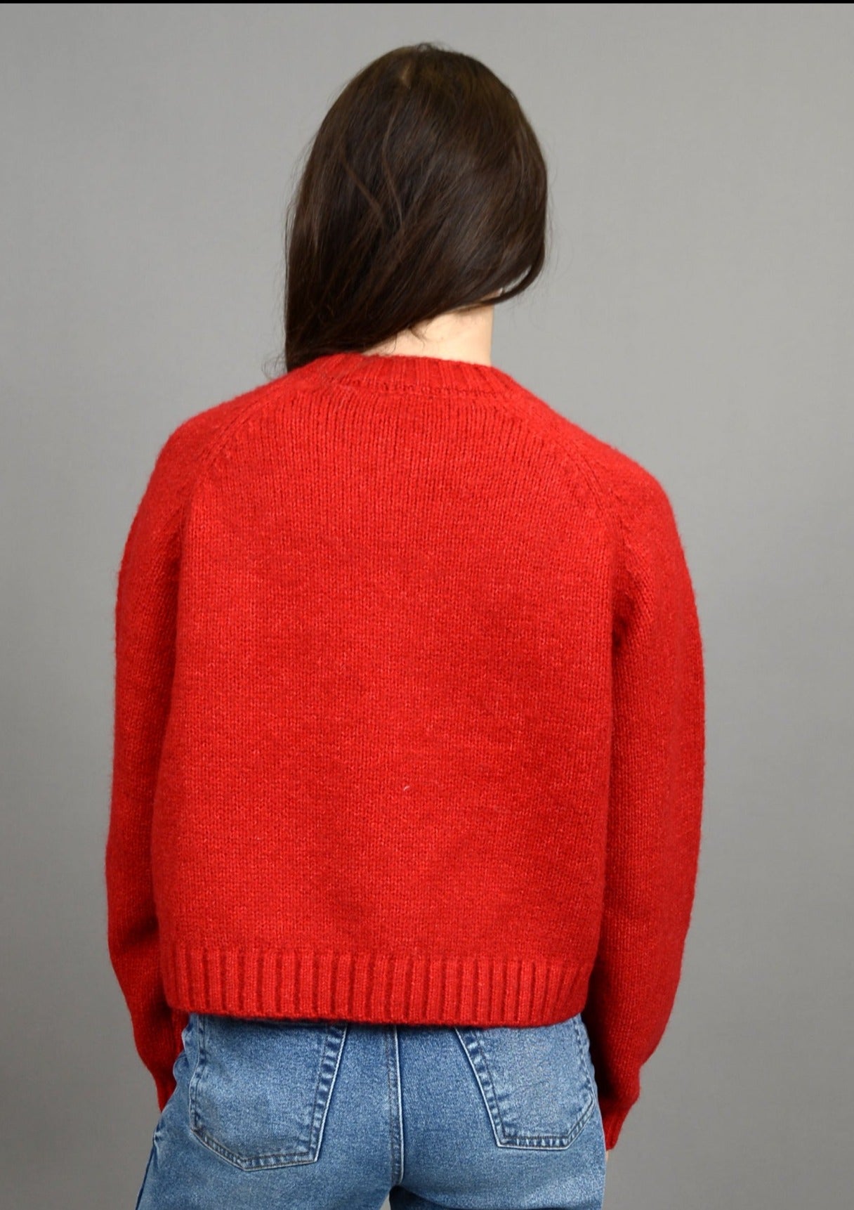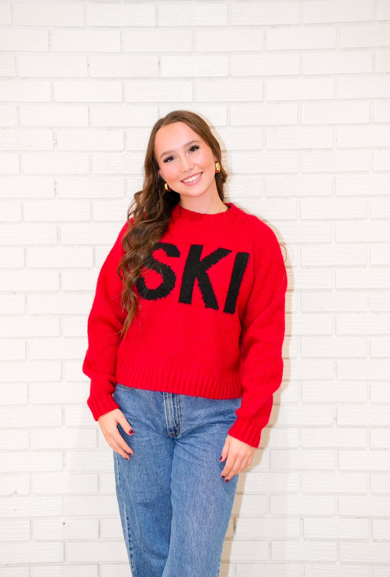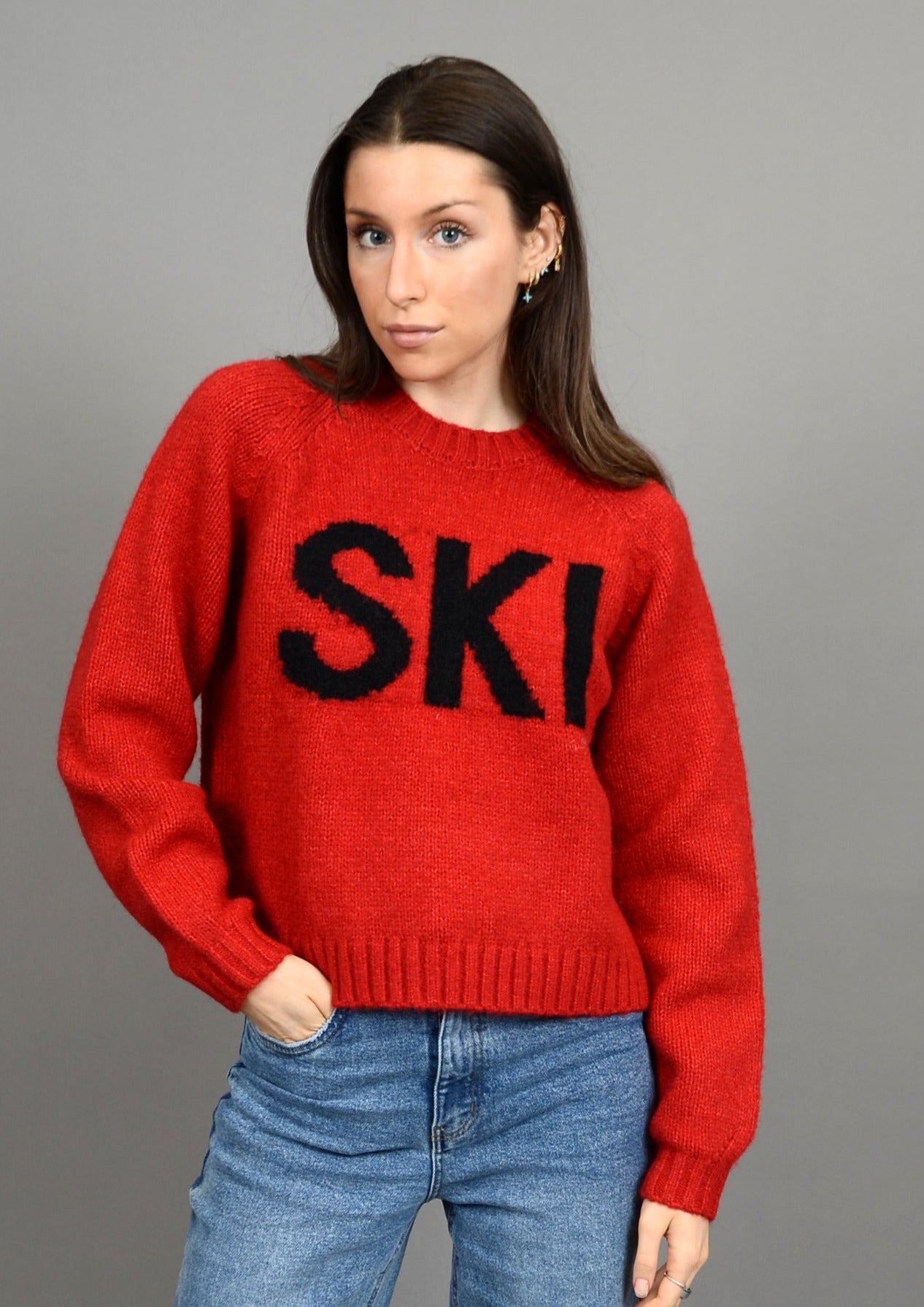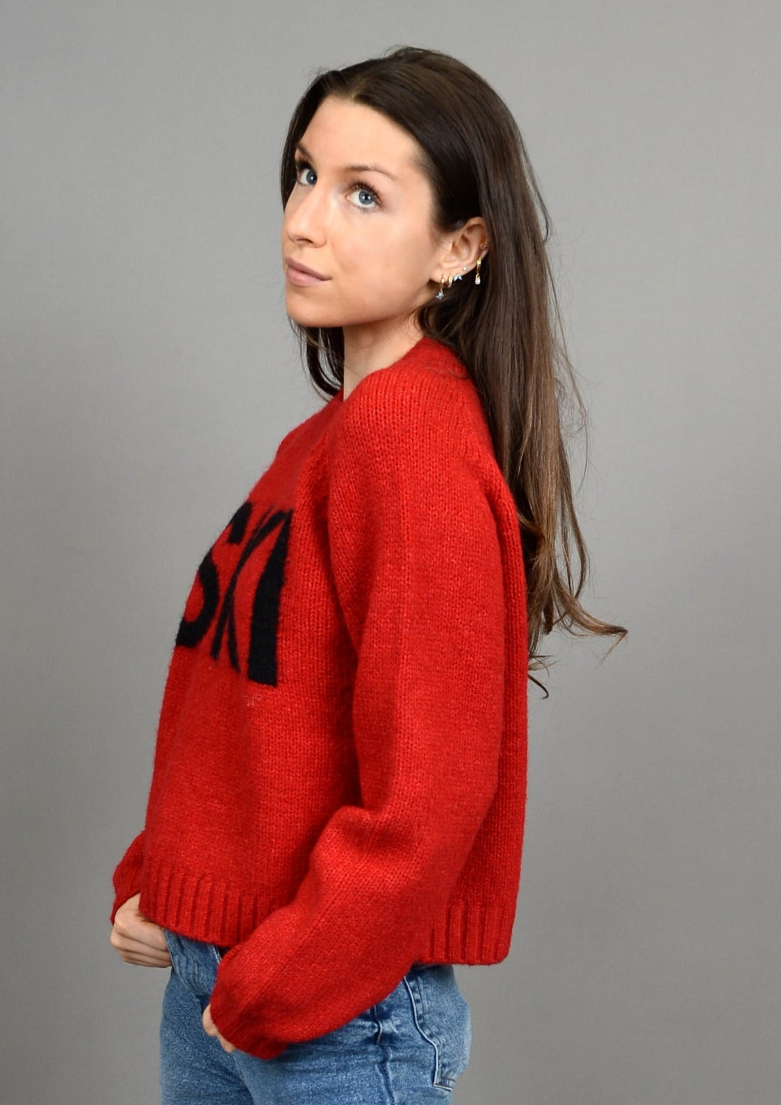 Perfect for a cozy winter look. The bold black text adds a sporty touch to the classic red knit design. It's a statement piece that combines warmth with a trendy aesthetic. Perfect for hitting the slopes or just staying warm in style.