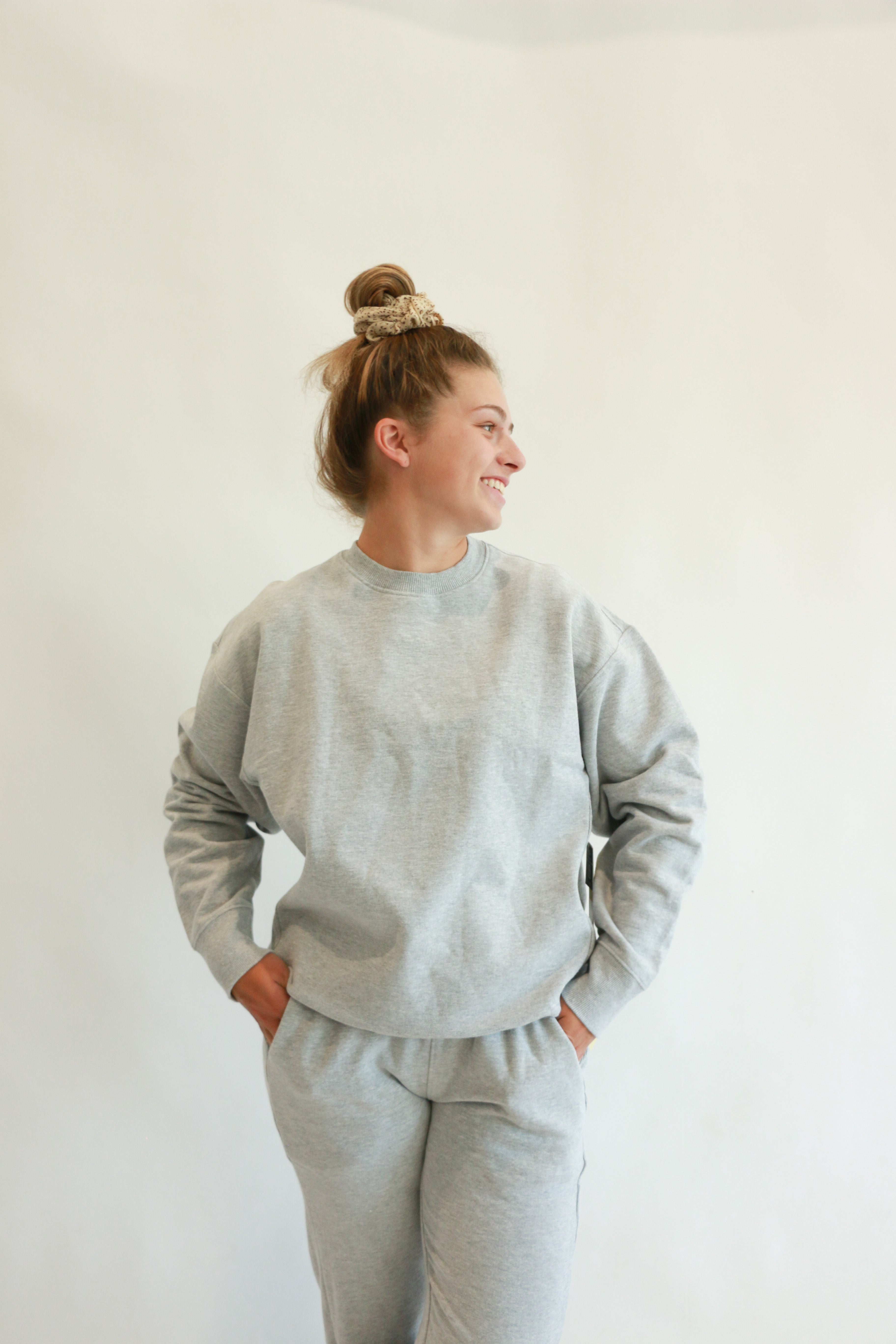Detail: Heather grey pullover crewneck with ribbed detailing on the sides