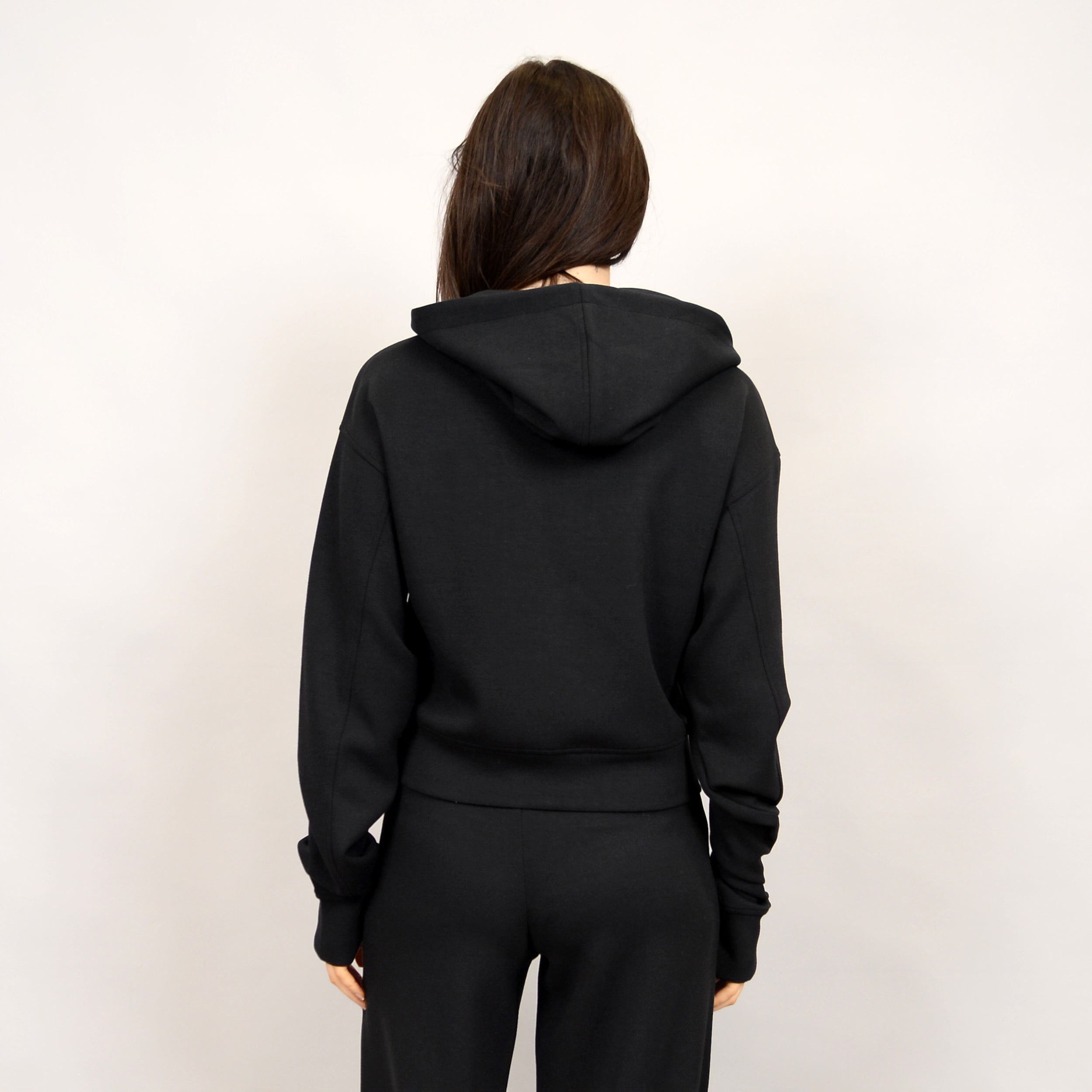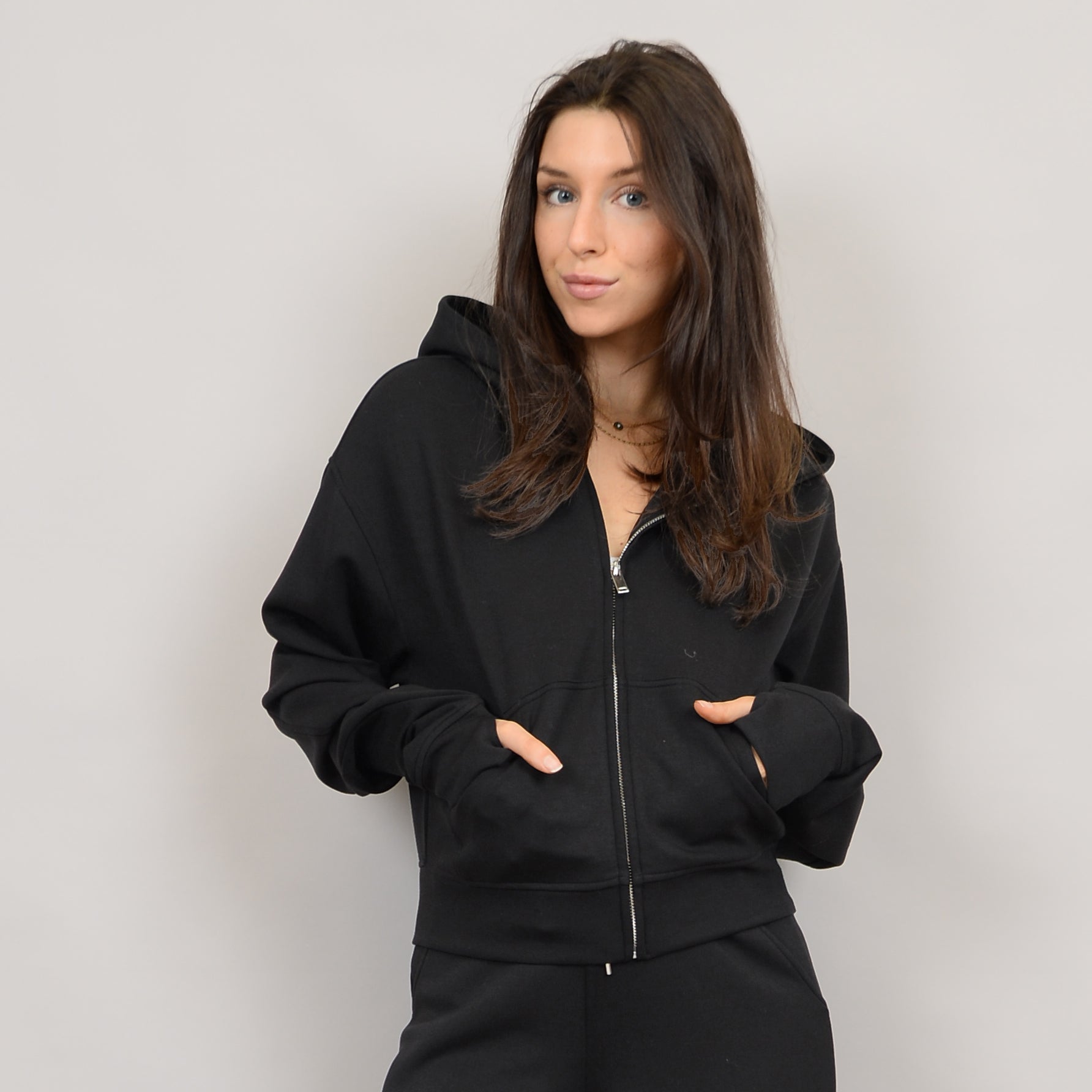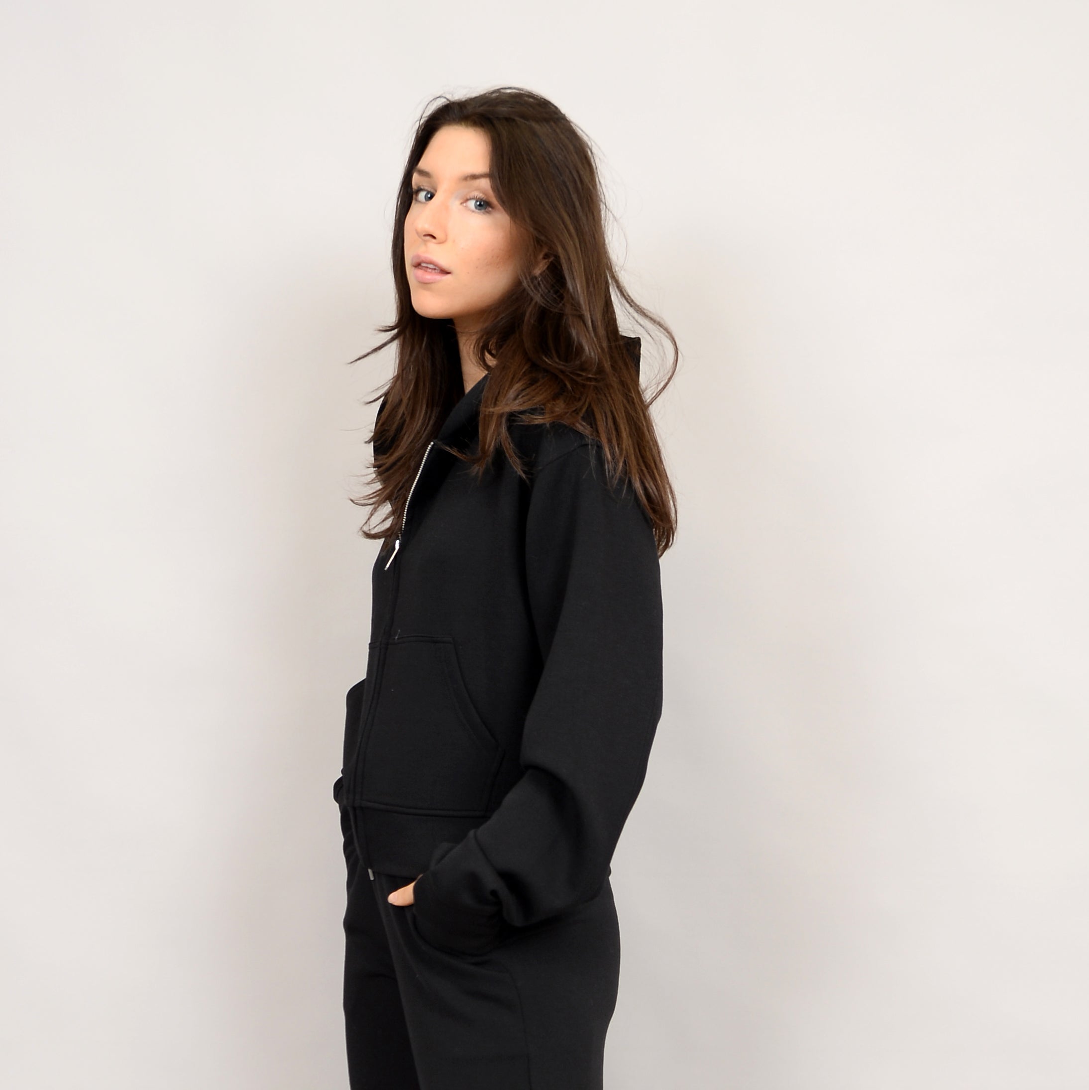 Details: Experience ultimate comfort and style with the Haidelyn Zip Hoodie. This basic hoodie features a 1 way zipper, perfect for any loungewear look. Stay cozy all day long in this versatile and chic black hoodie.