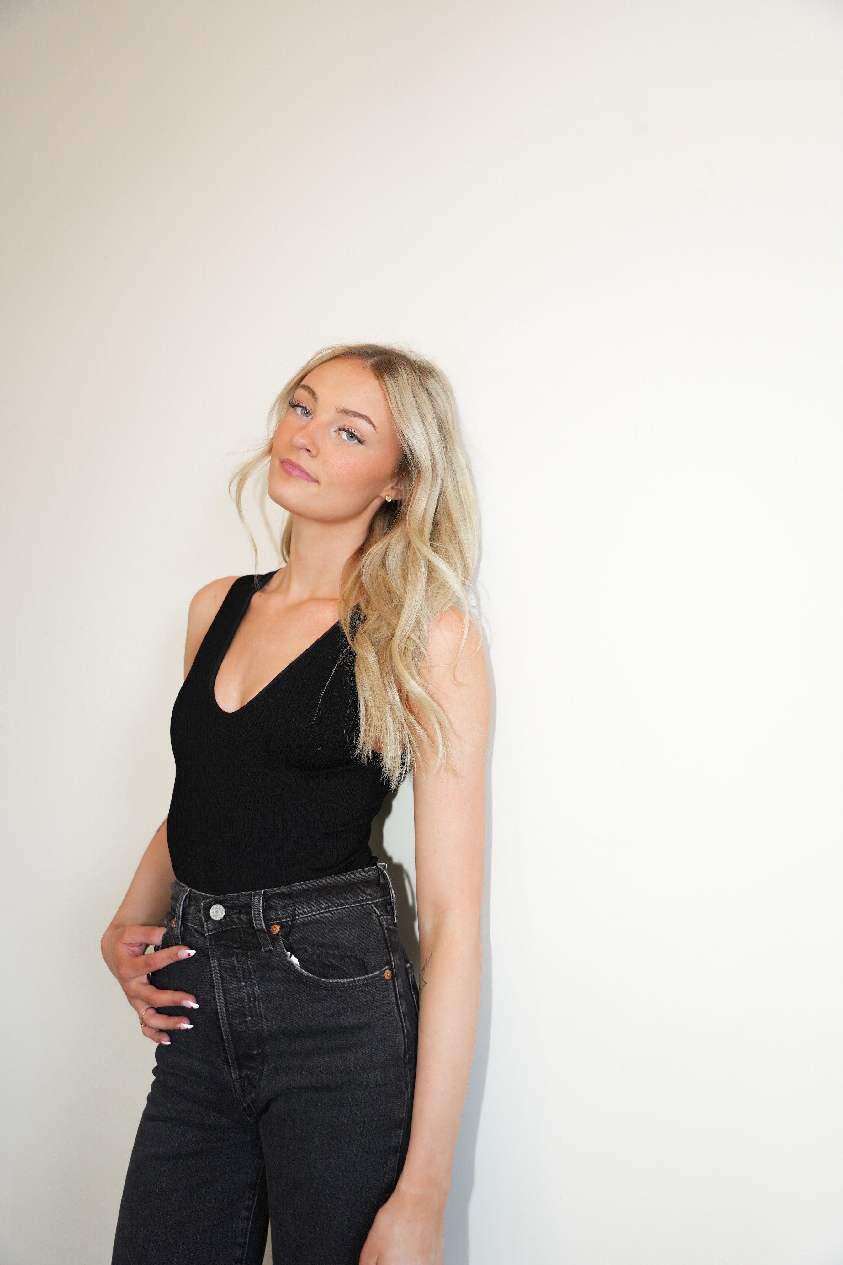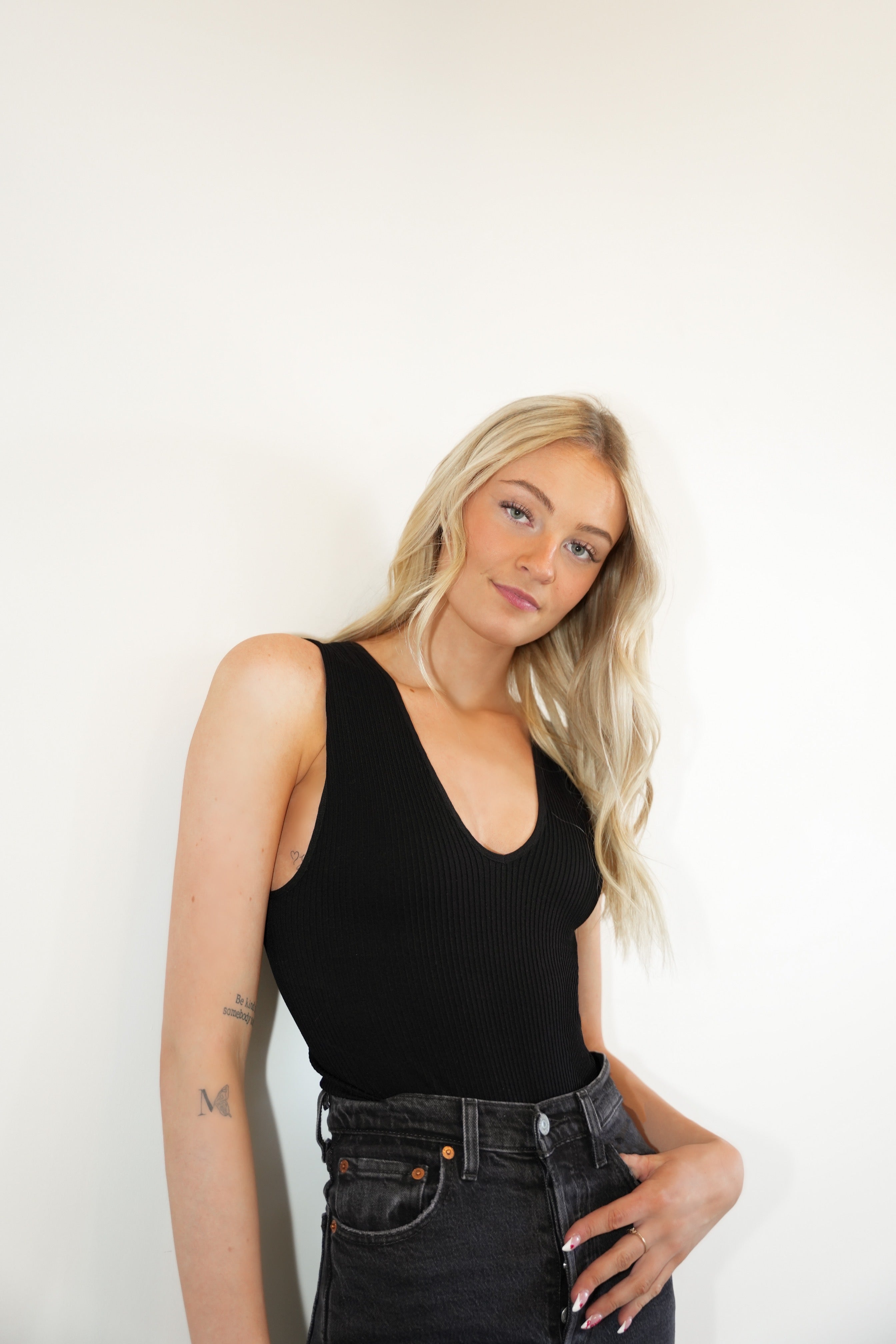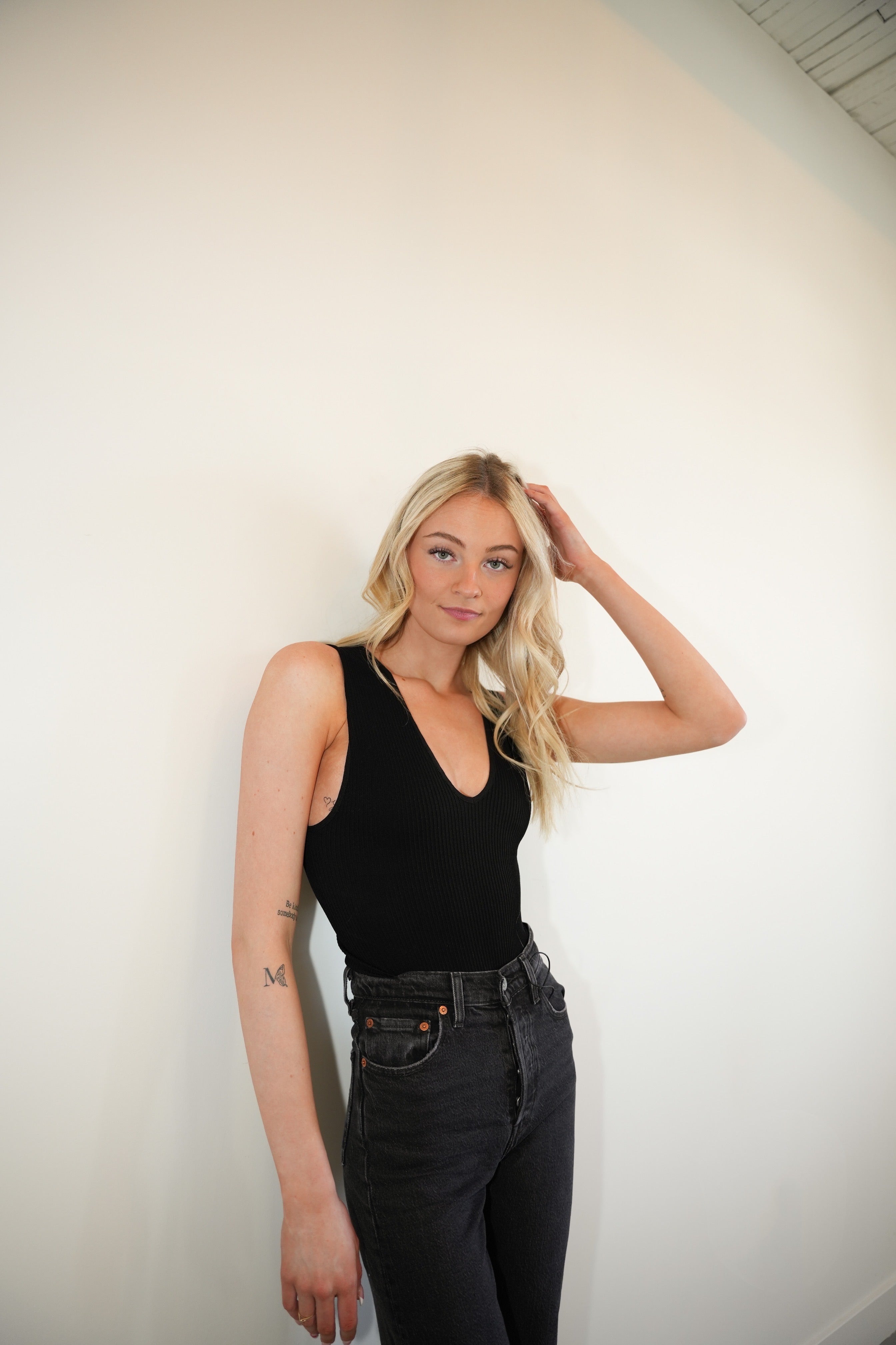 This is a body-hugging ribbed bodysuit, with a v-neck front and back neckline.