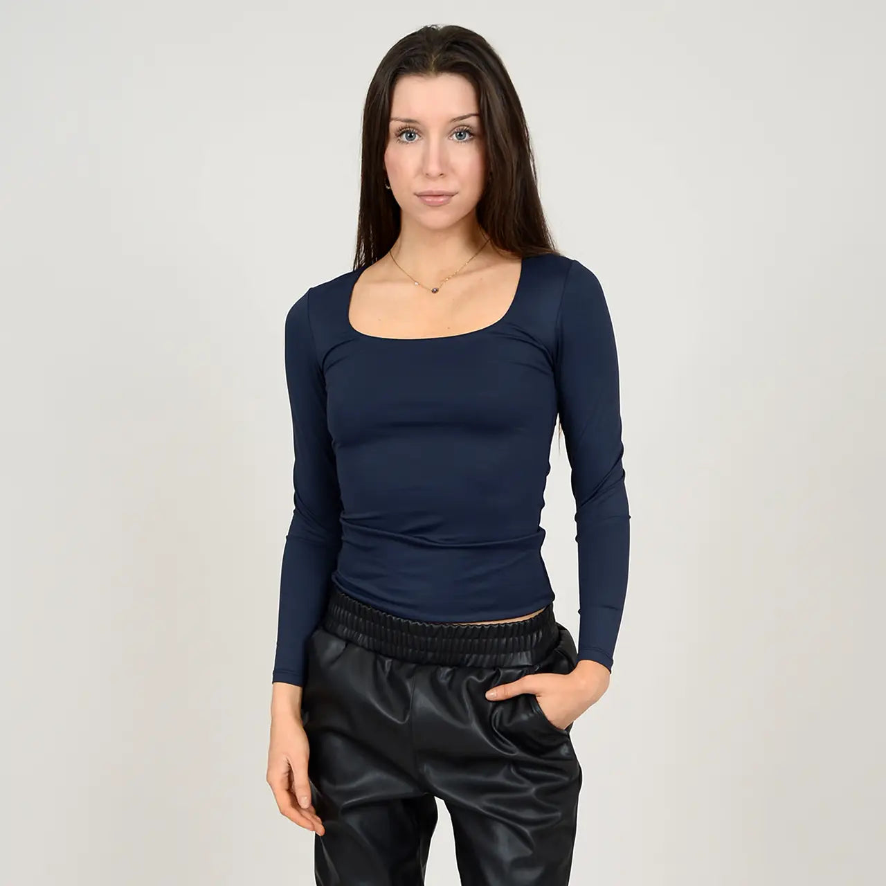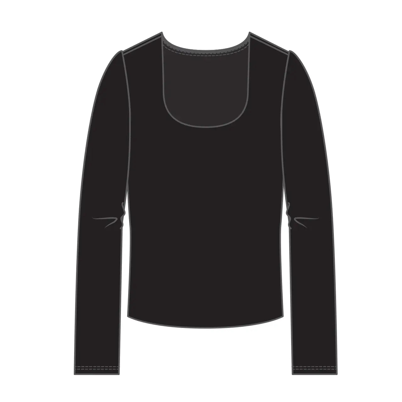 Detail: Black long sleeve top, u-neckline, regular length in body, double-layered fabric, high stretch technology, buttery soft feel.
