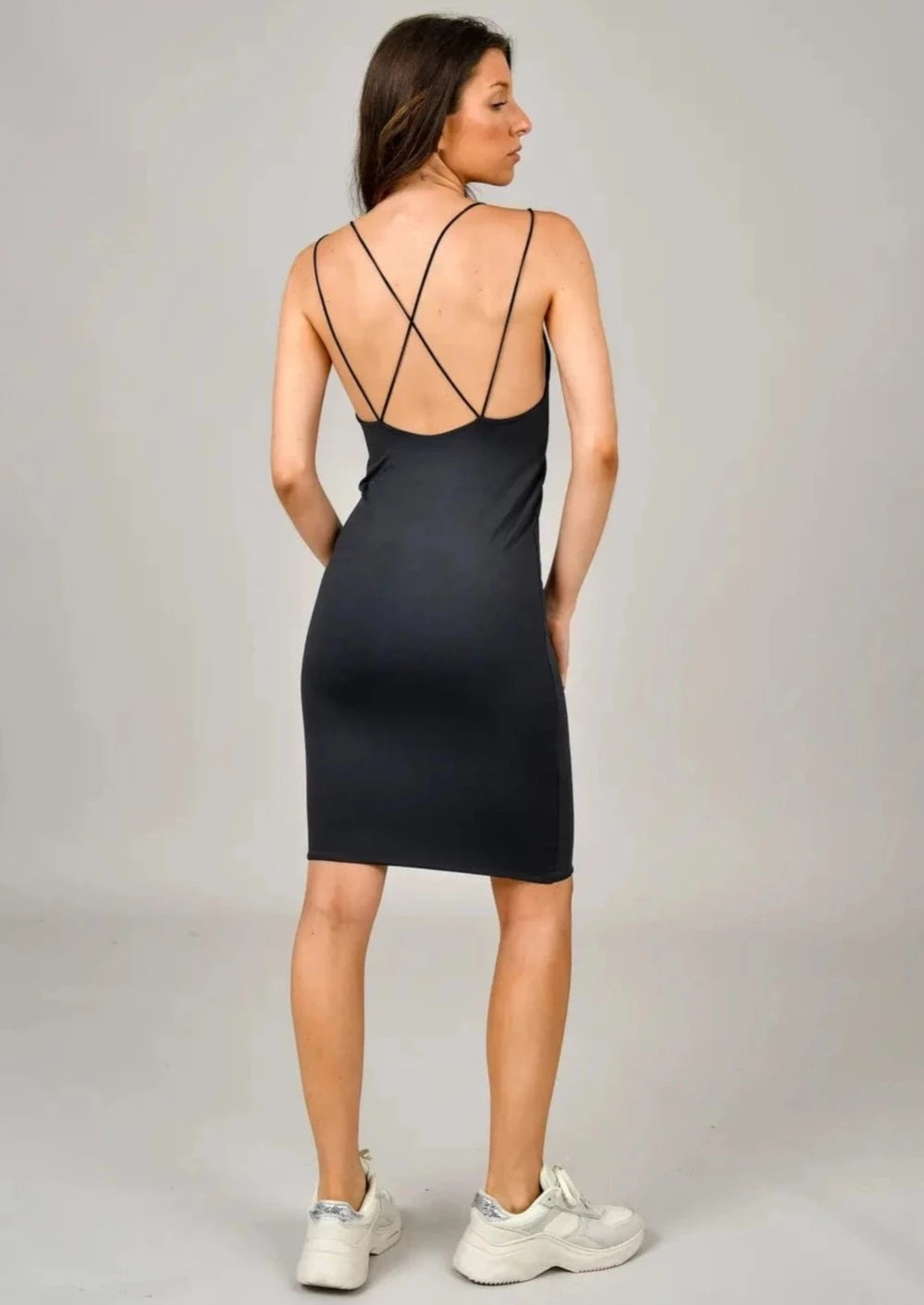 Detail: Midi dress, double strap, criss cross back, double-layered fabric, high stretch technology, buttery soft feel, double lined