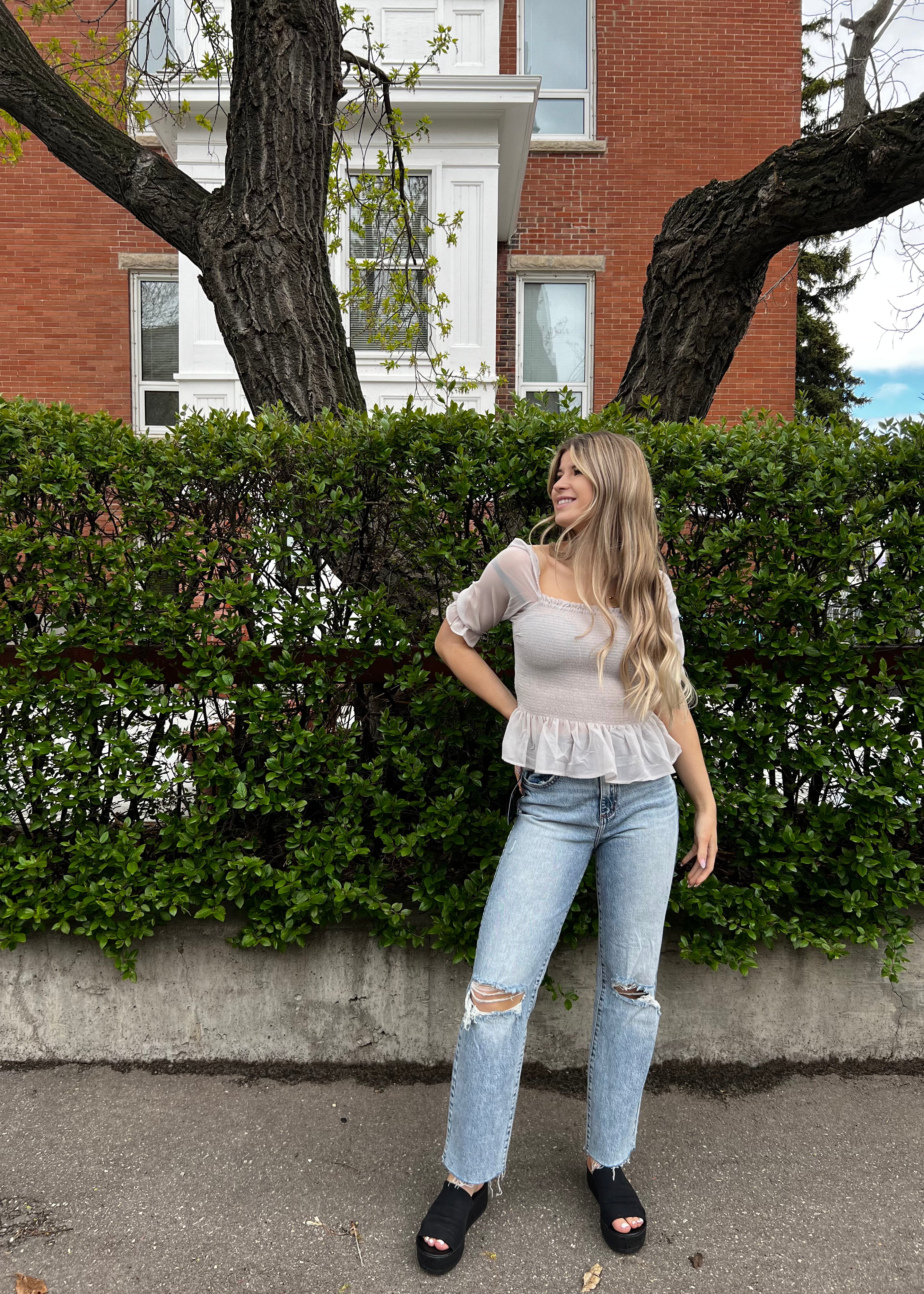This blouse has a beautiful square-neck with puff-sleeves and a smocked bodice.