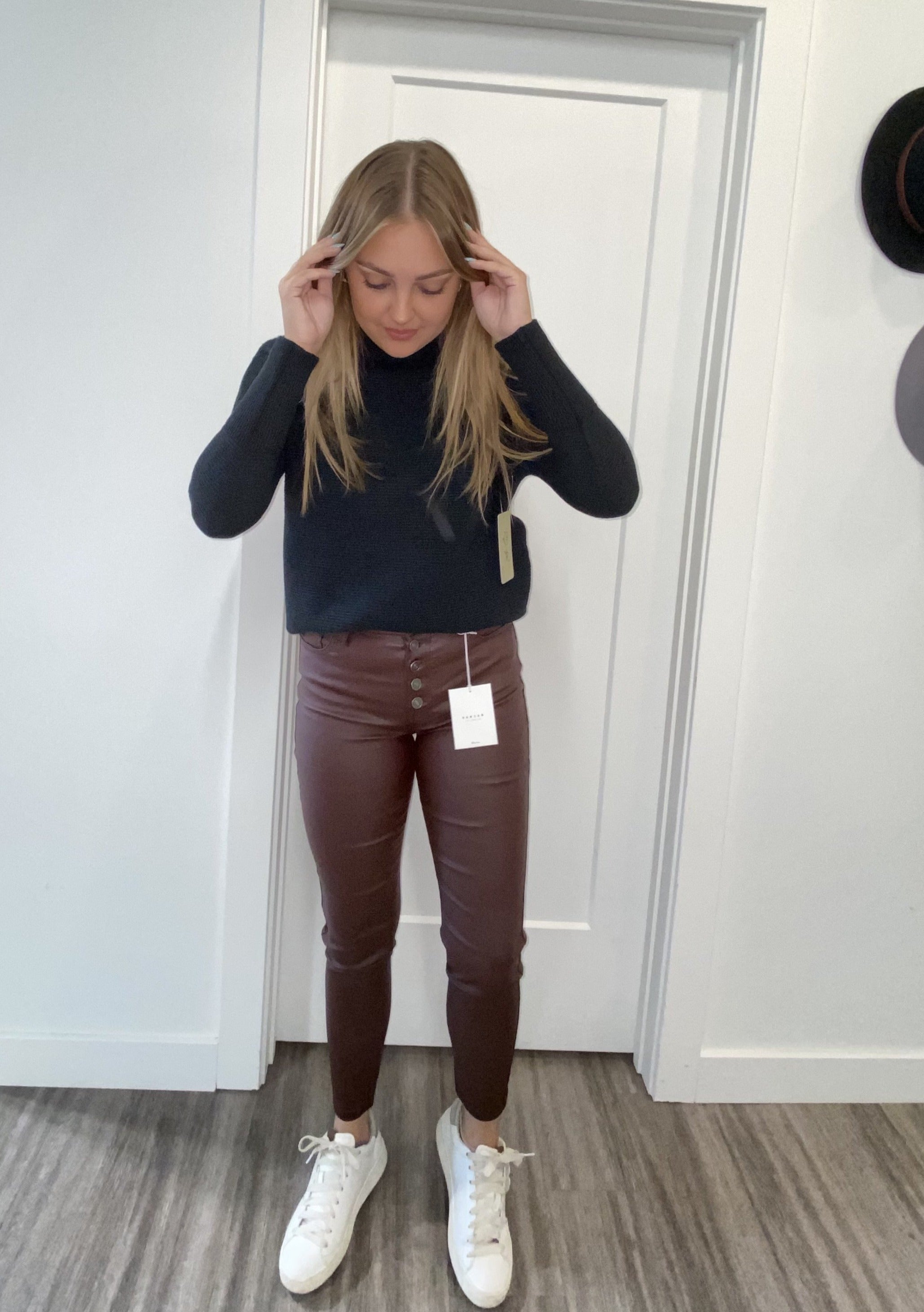 Our Autumn High Rise Pants come in a Faux Leather material and an ankle skinny cut that accentuates your curves giving you a sleek and chic fit. Sits above the natural waistline as they taper down the leg and finish right at the ankle giving you a flirty style that's perfect for a night out. Made with stretchable faux leather fabric that gives you a skin-tight feel while hugging in all the right places. Features a classic five-pocket design and a five-button front closure.