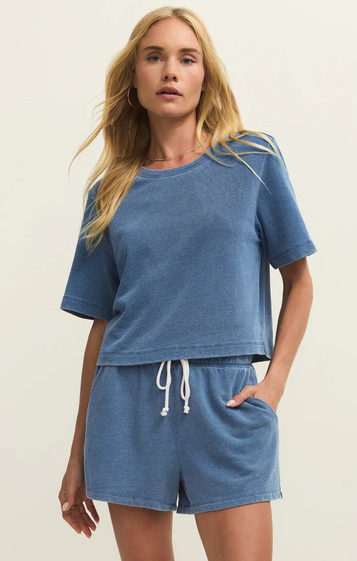 Kicked-back and cool, this knit denim French terry short has a lived-in look and feel. The contrast drawcord at the high-rise waist gives a little sporty twist, while the slash pockets keep it functional.