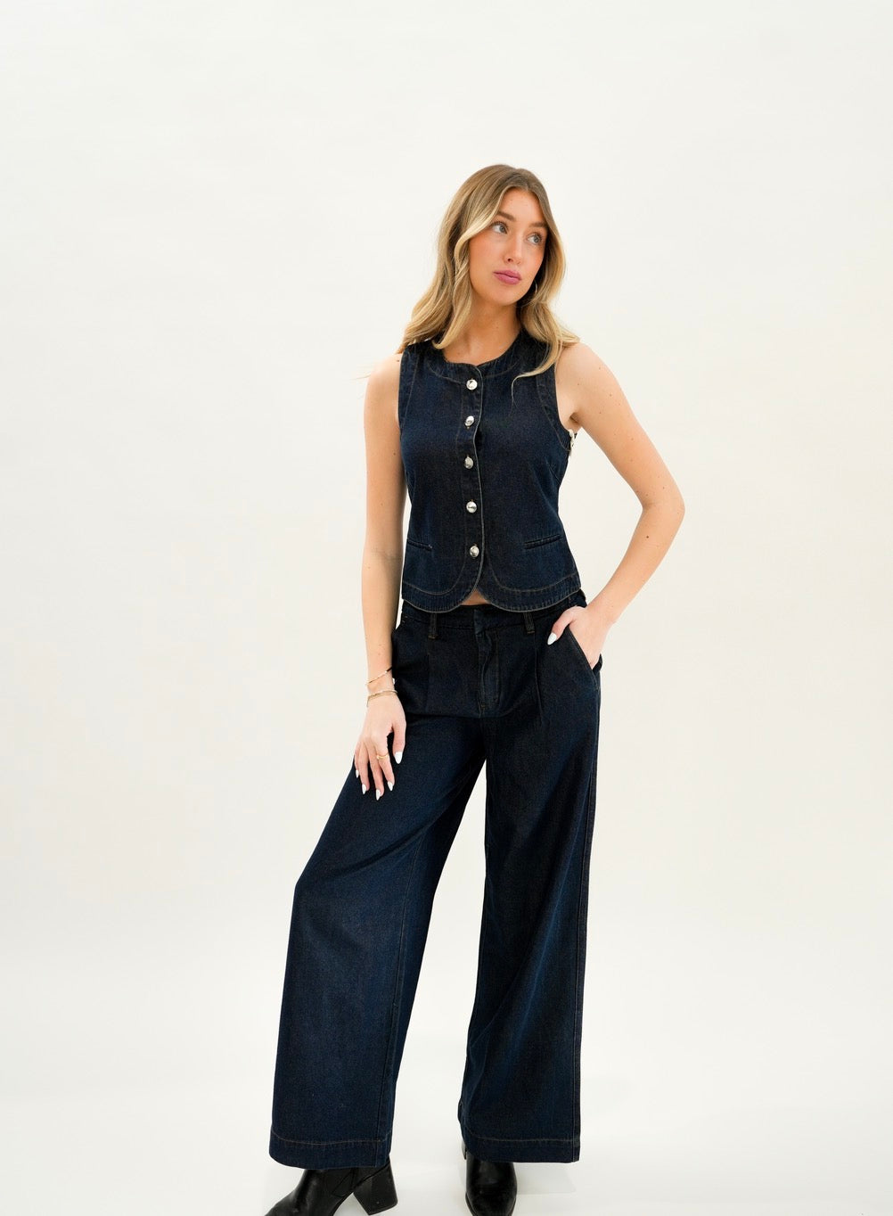 This timeless denim vest is designed to be suitable for both elevated looks and casual days. Made to have a structured fit, with the classic button-front design, this denim vest can be a layering item or a statement piece. Pair with jeans to achieve the denim on denim look we all love.