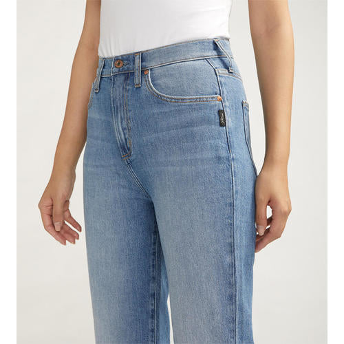 Detail: Straight leg jeans with a light indigo wash. High Rise. Straight. Low Stretch. 5-pocket styling with a zip fly and button closure.