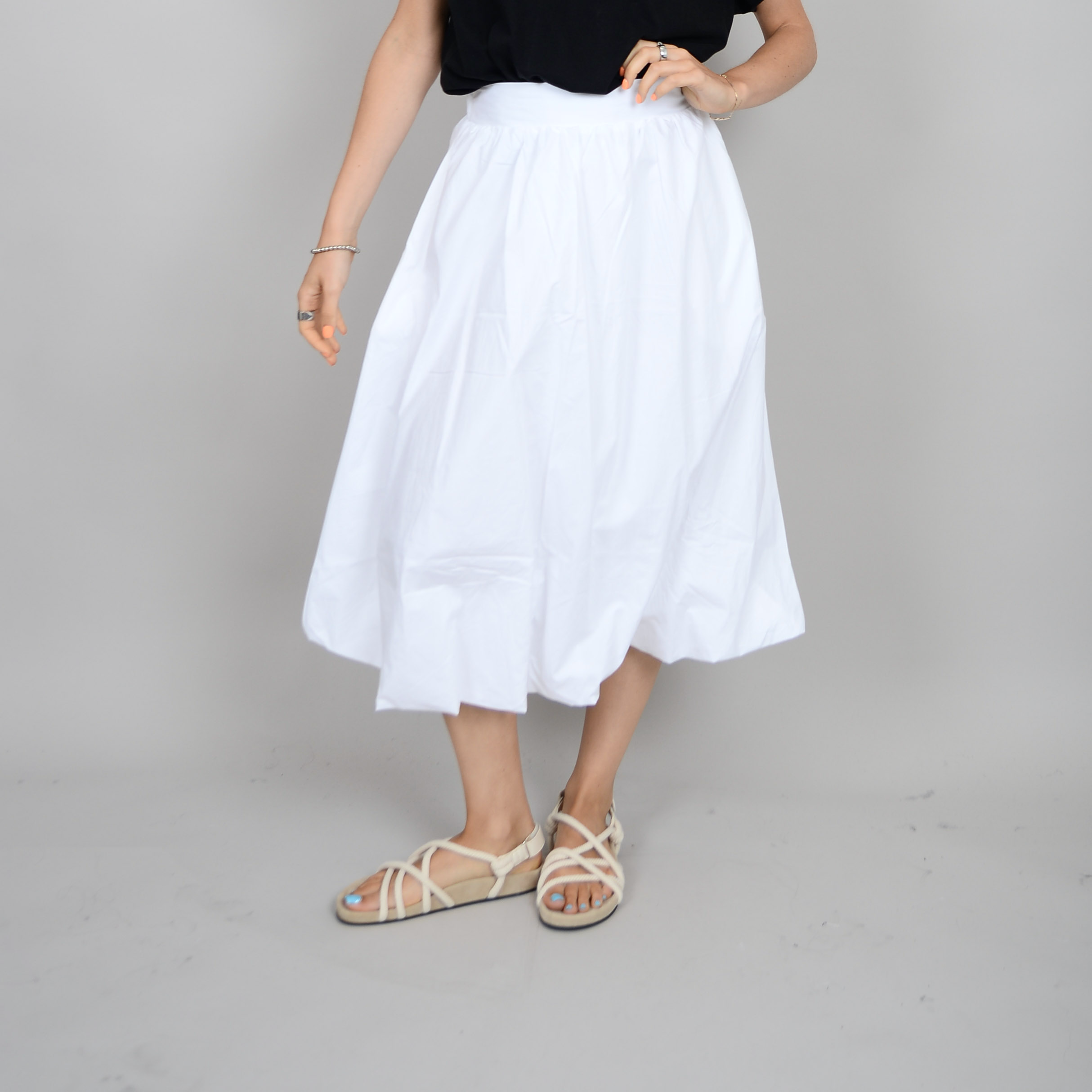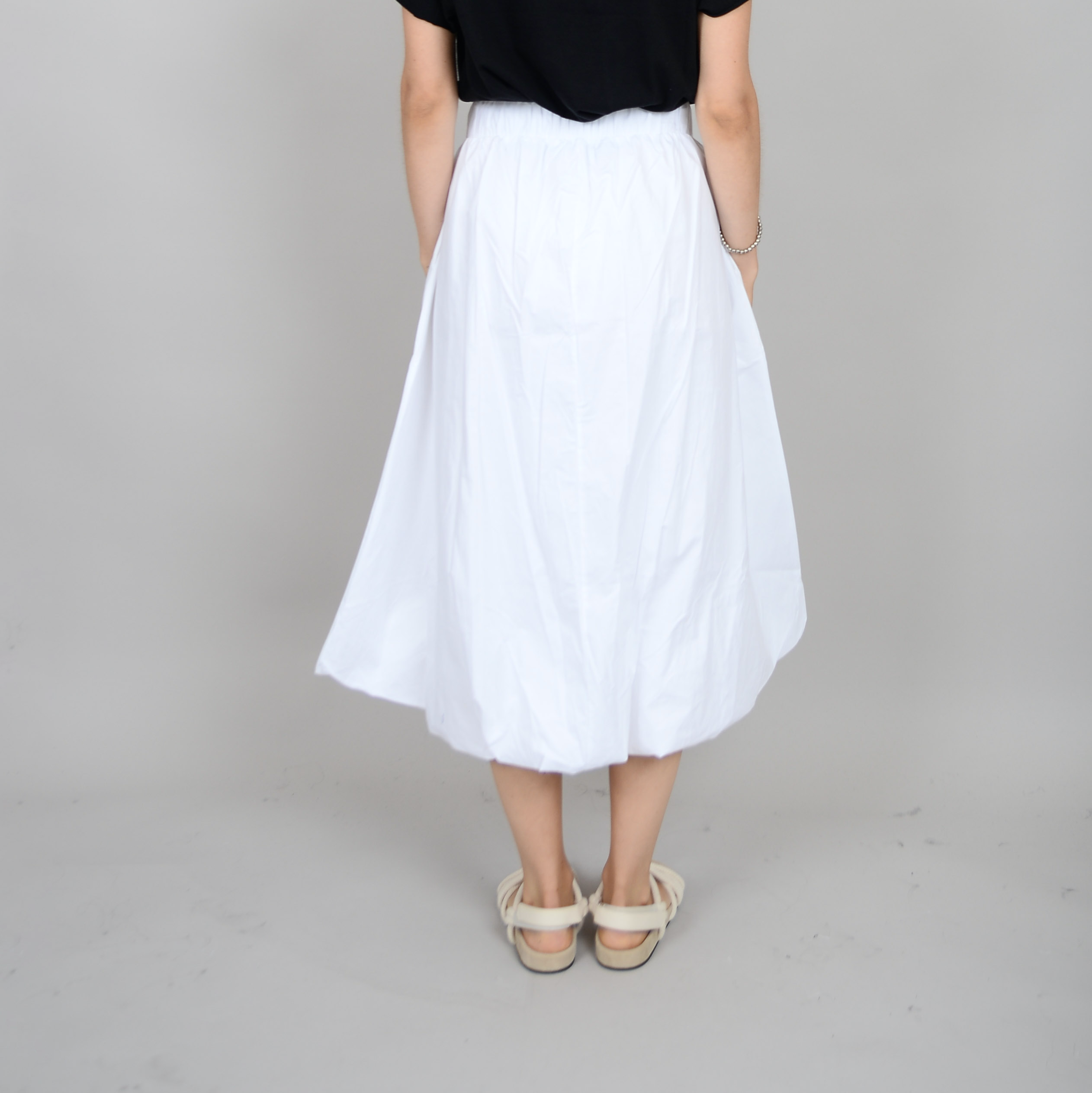 Details: White, cotton, balloon style skirt, elastic waistband at the back, double lined.