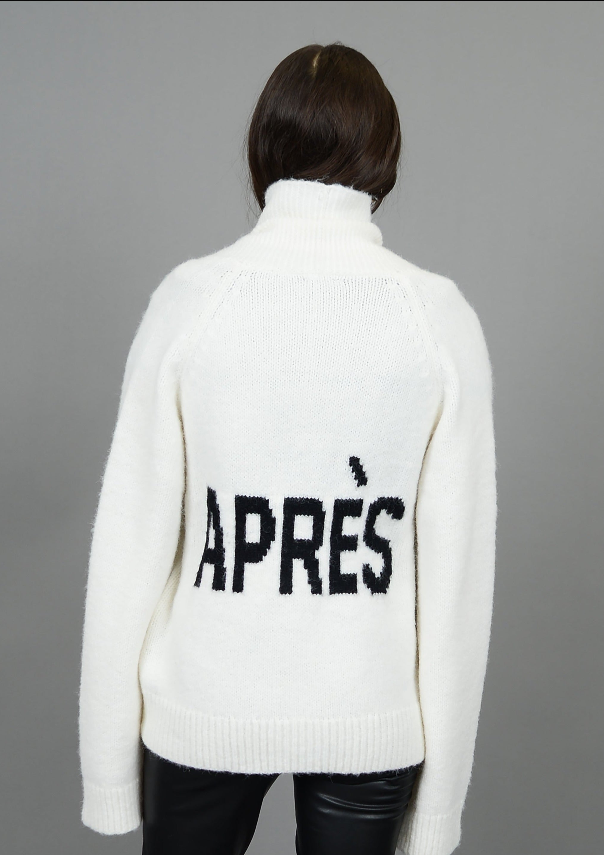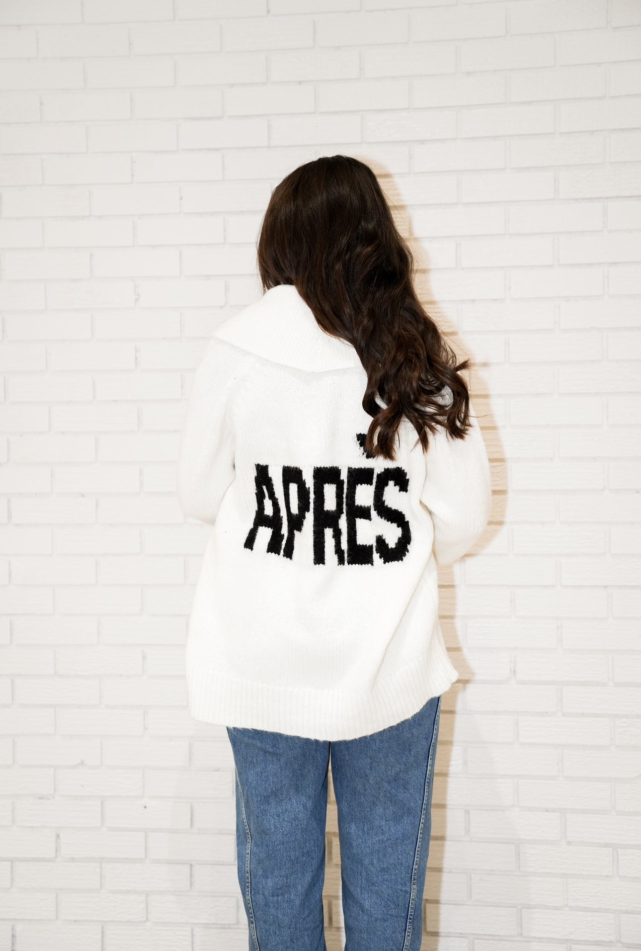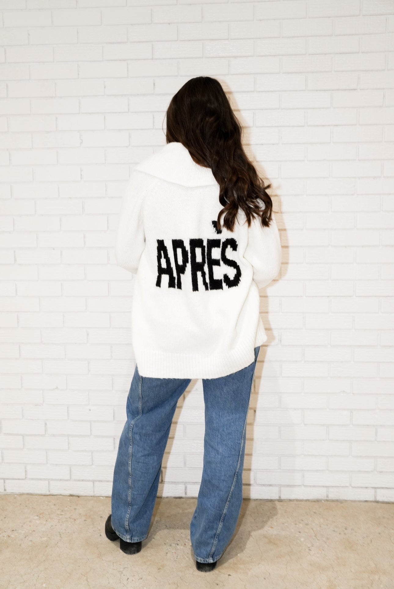 Details: Knit cardigan, Après written across the back in black, large collar, two front functional pockets, big button closures, ribbed detail on collar, cuffs, waistline and top of pockets, cuffs can be unrolled