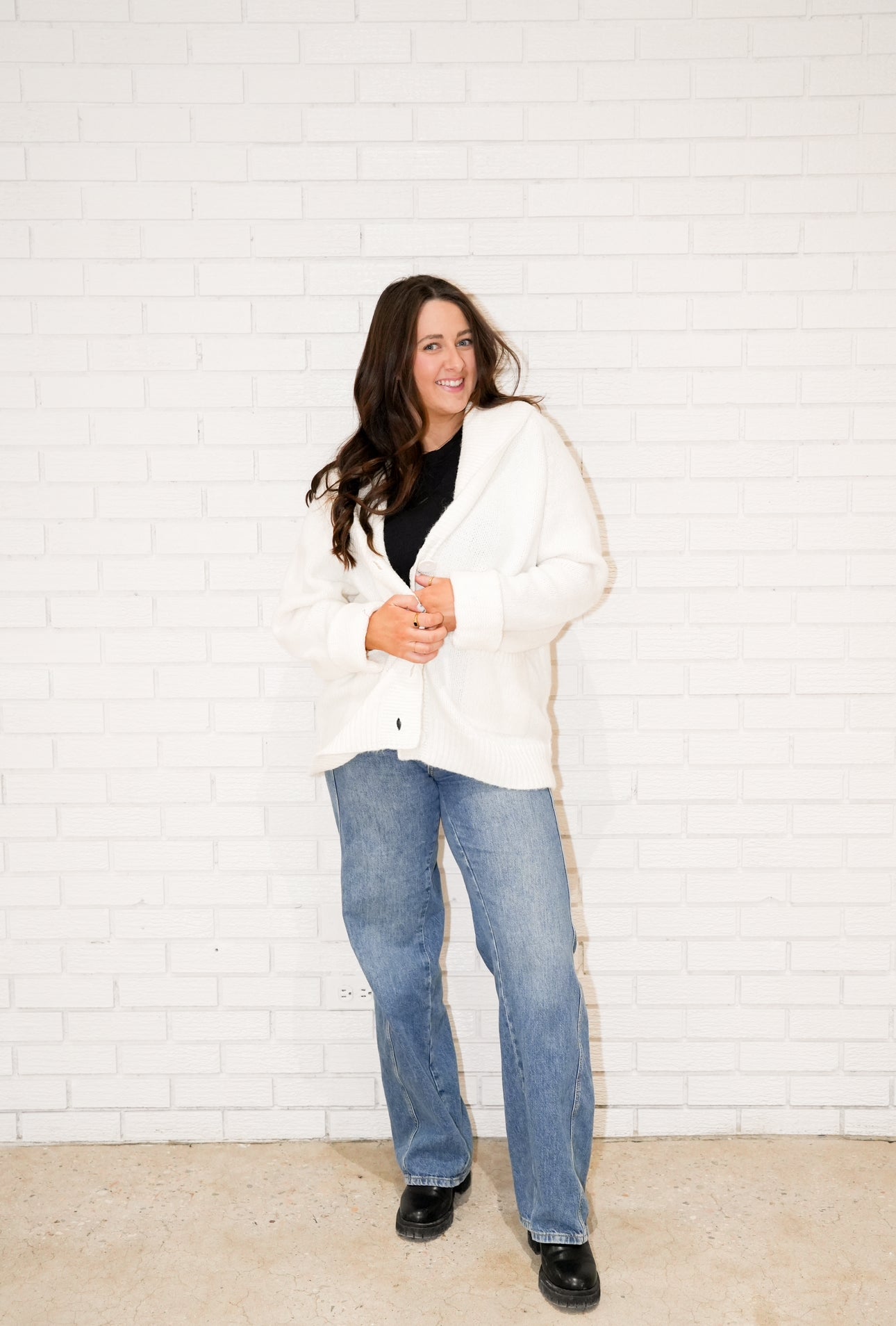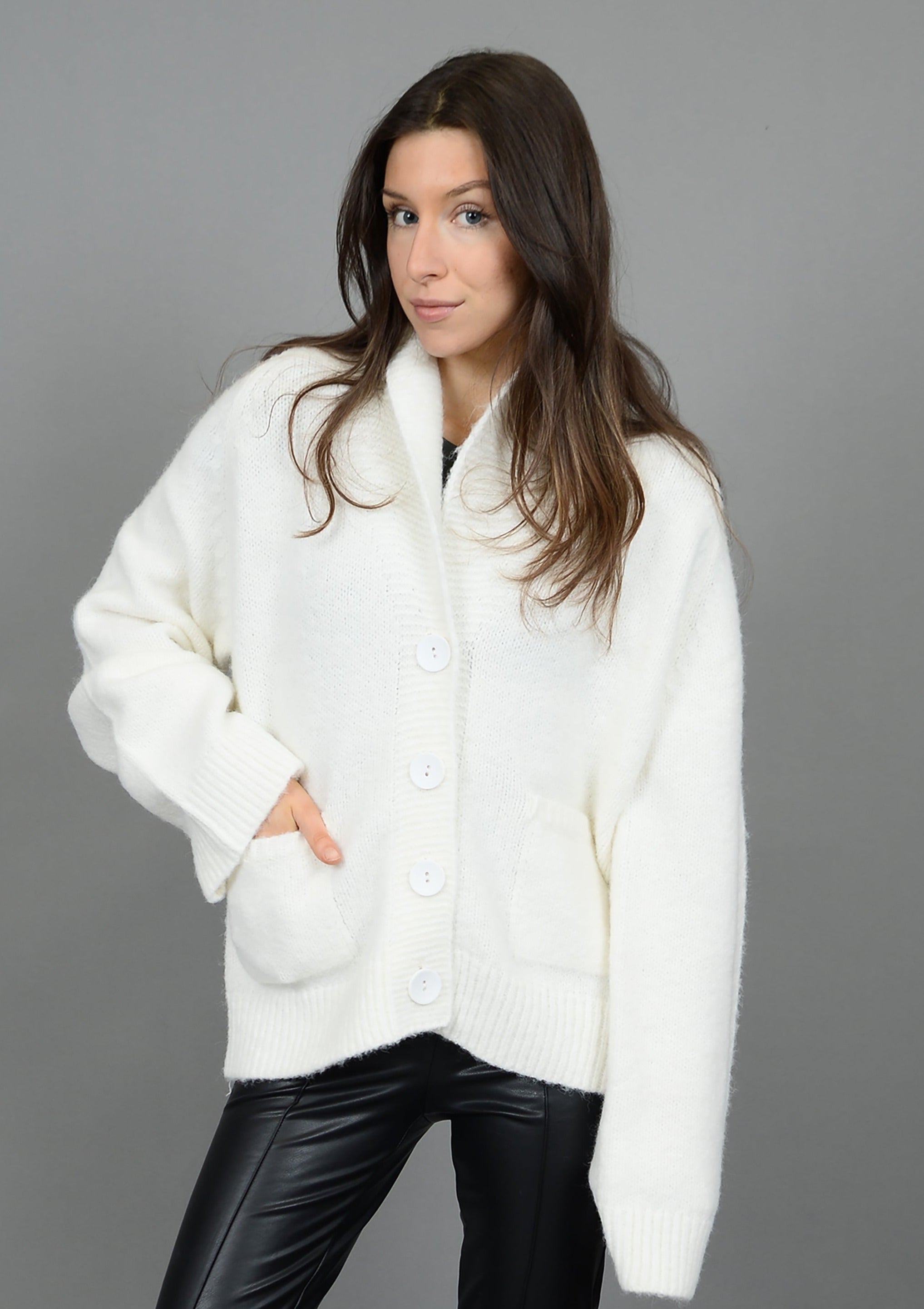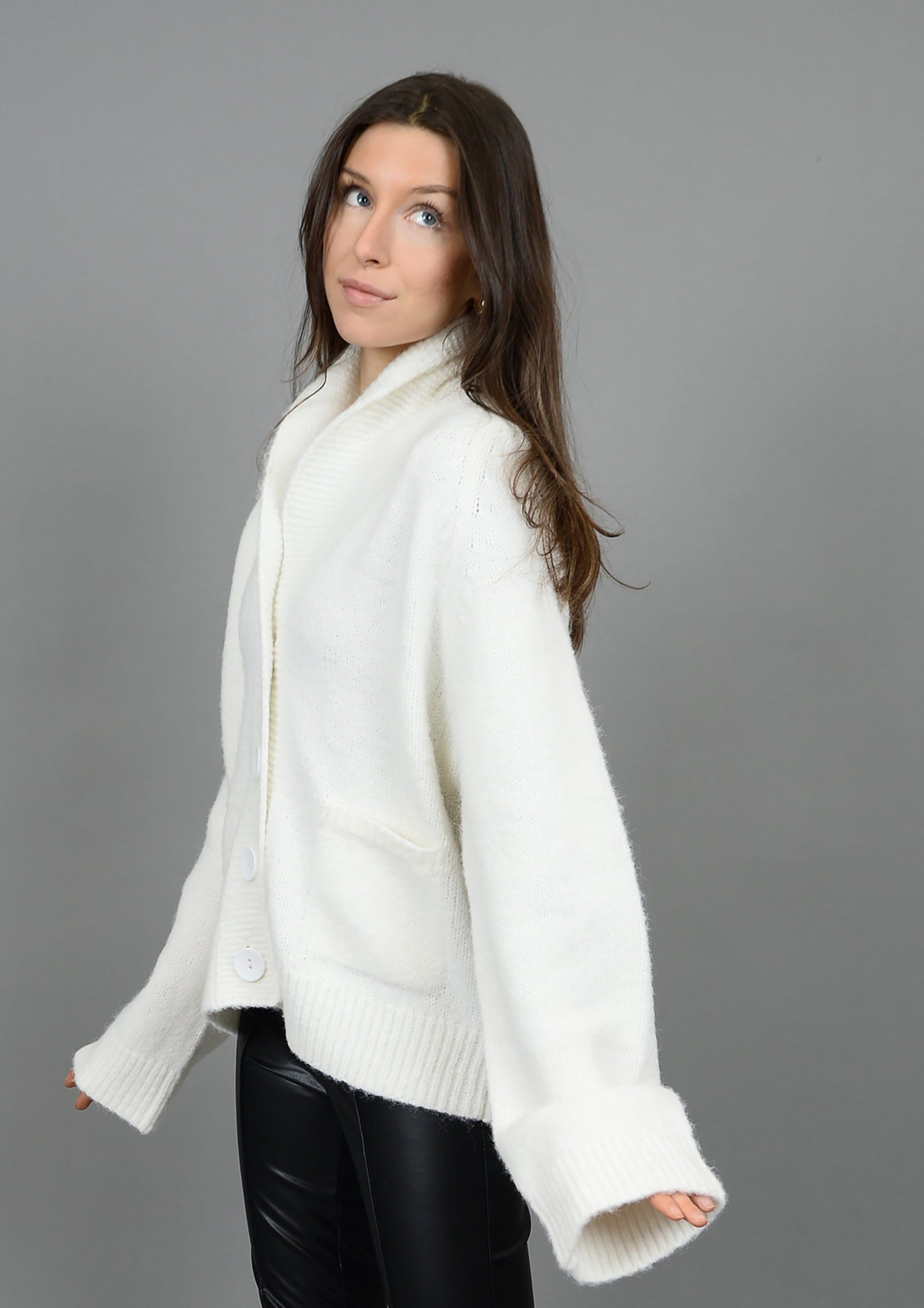 Details: Knit cardigan, Après written across the back in black, large collar, two front functional pockets, big button closures, ribbed detail on collar, cuffs, waistline and top of pockets, cuffs can be unrolled