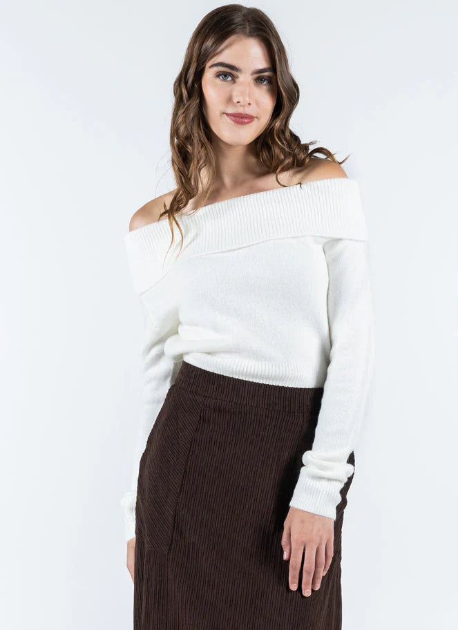 A lightweight off shoulder sweater with a ribbed off shoulder, sleeves and waistband.