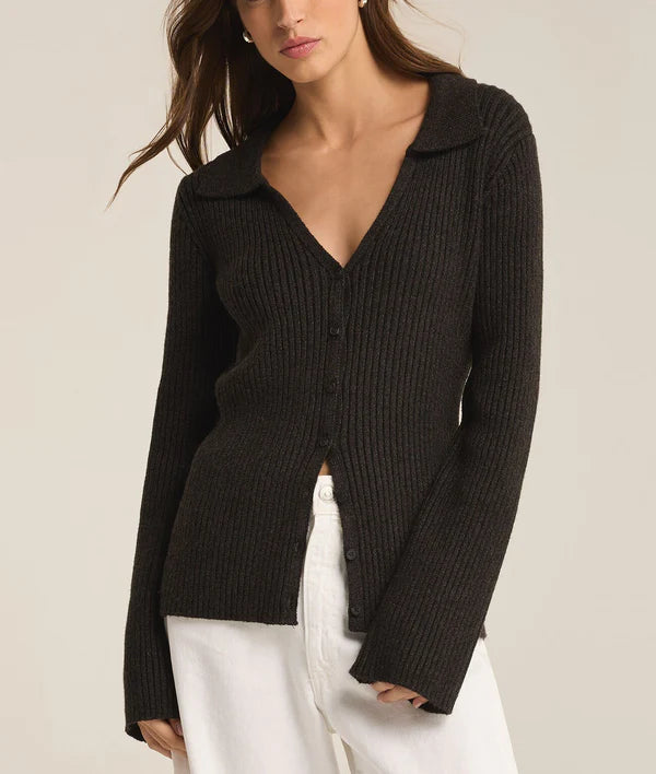 Elevate your look in our collared long sleeve sweater, featuring soft ribbed sweater yarns and a classic button-up front. Perfect for layering or wearing solo, this piece combines comfort and style effortlessly.
