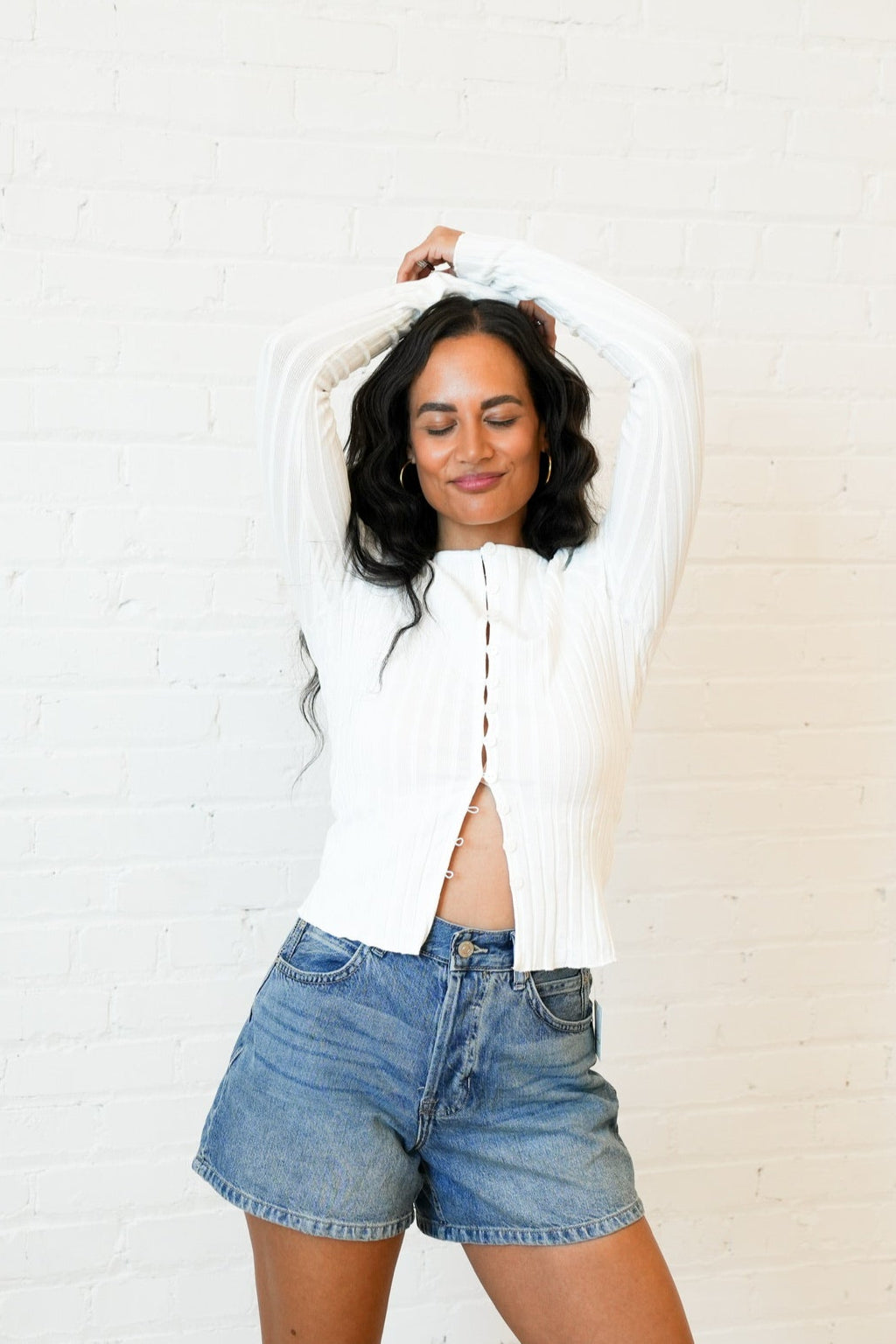 So simple, this timeless top features a ribbed fabrication and slim-fitting silhouette with button closures and long-sleeves.