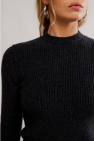 Ribbed knit texture, mock neckline, long sleeves, soft-touch fabric, slightly cropped fit