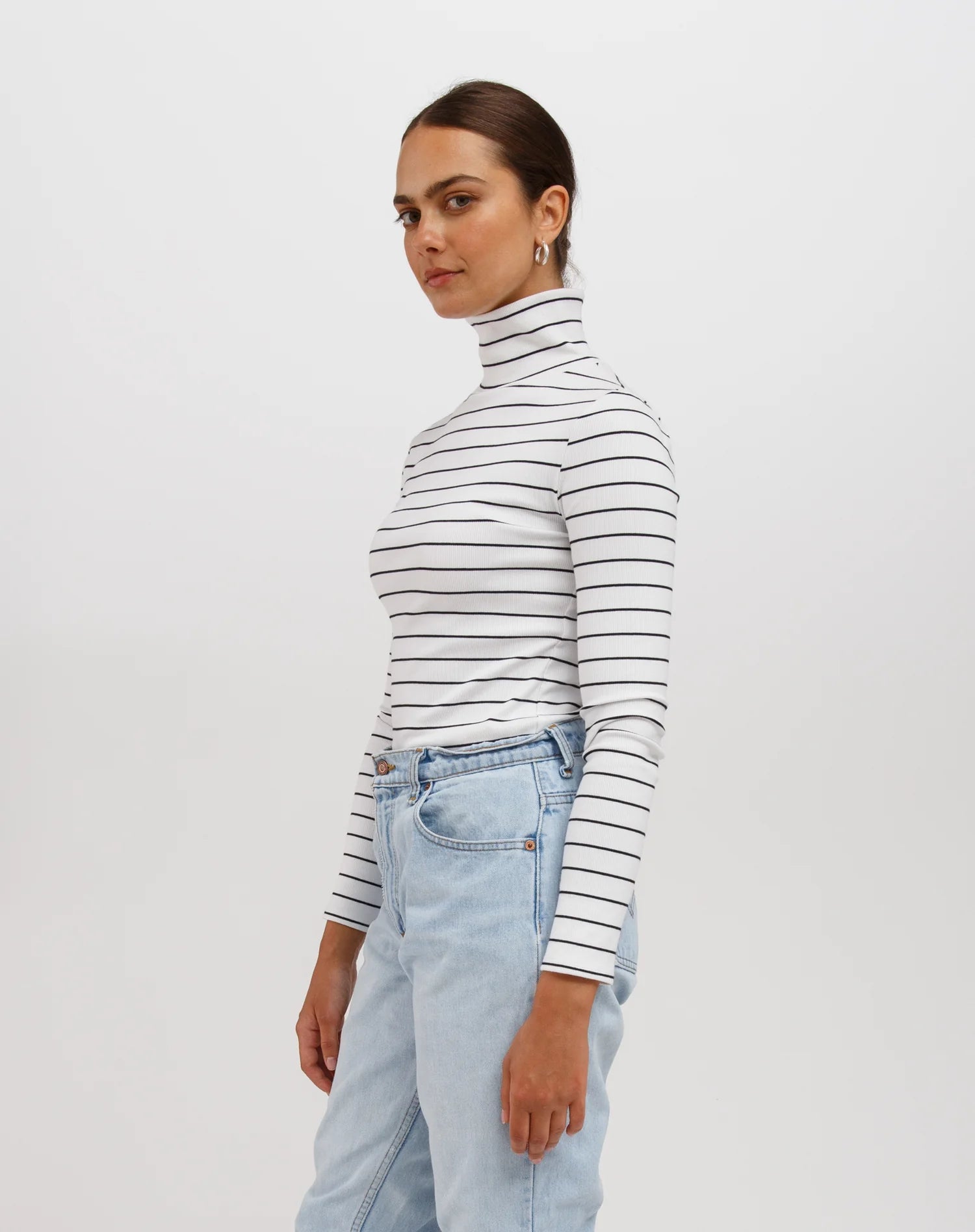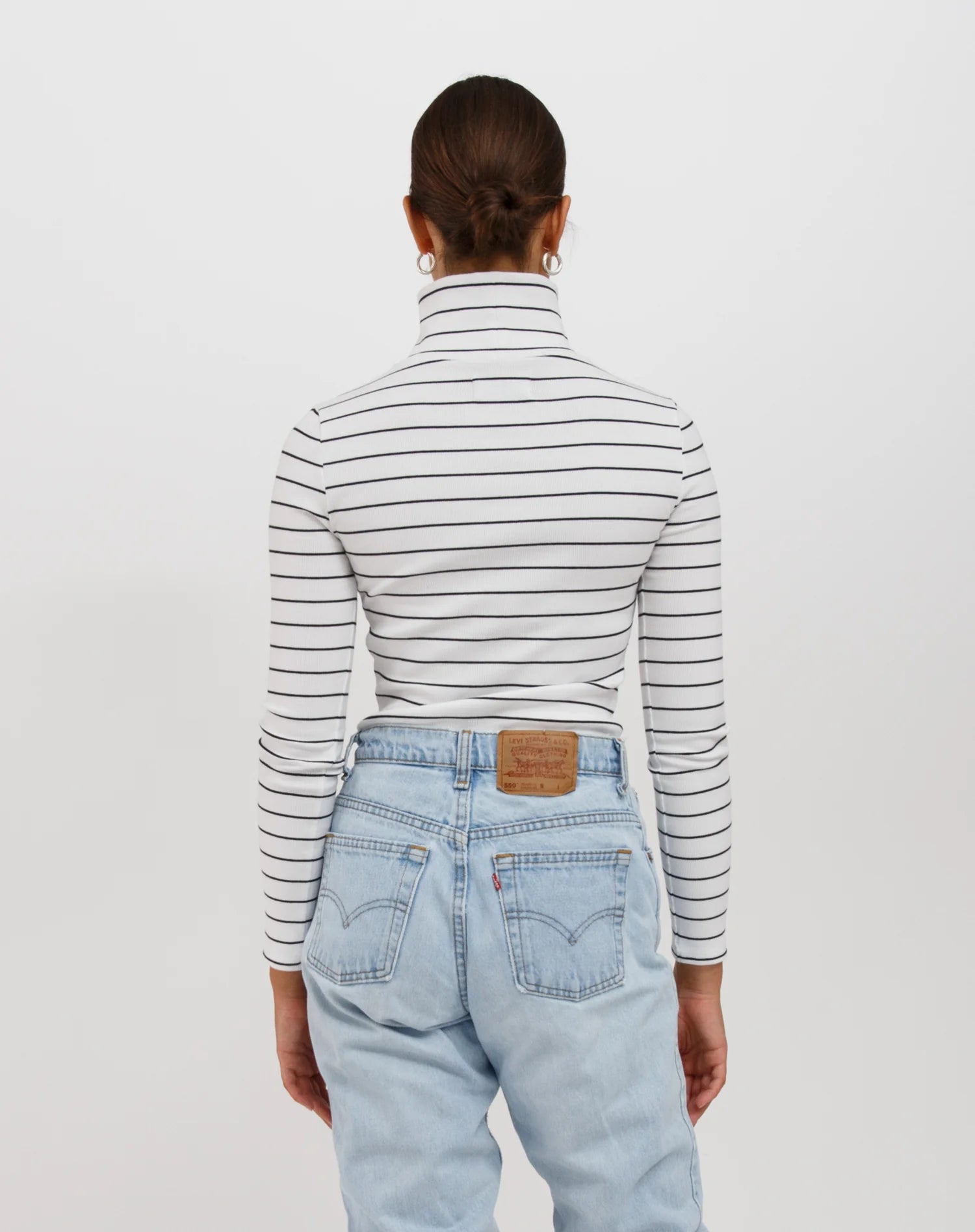 Our 90's-inspired Ribbed Turtleneck has a fitted body with a high neck. You can fold the collar or wear her fully up for a chic look.