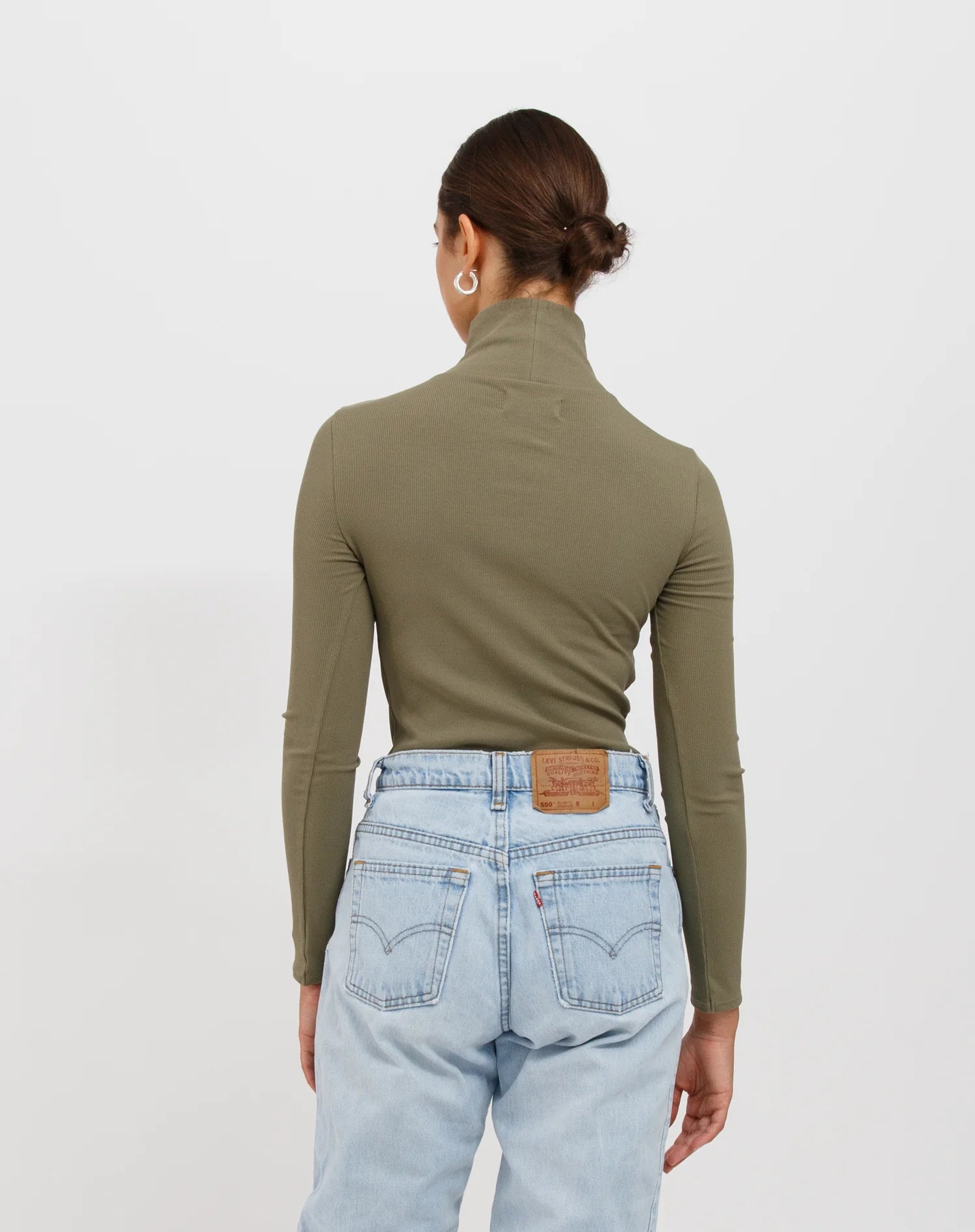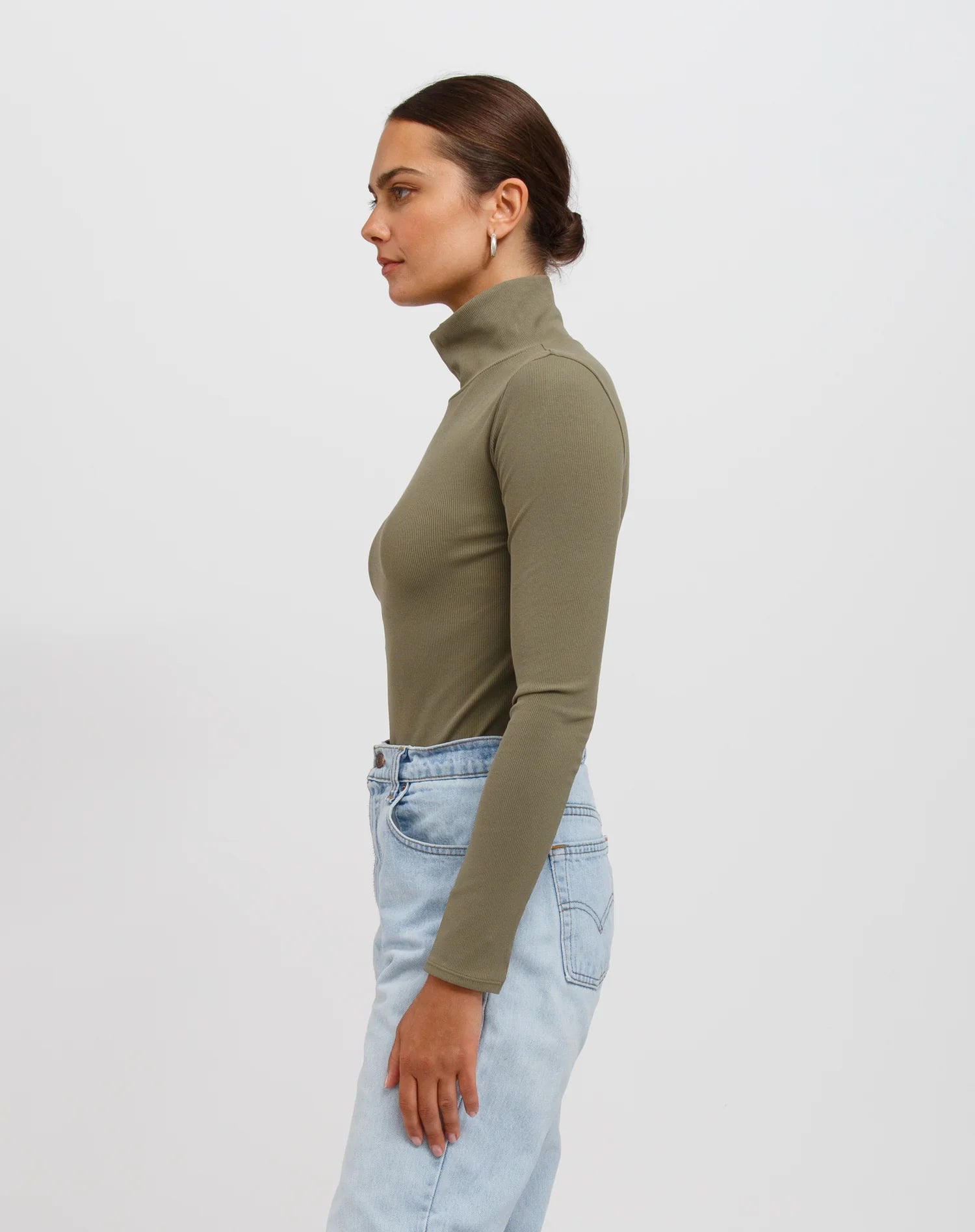 Our 90's-inspired Ribbed Turtleneck has a fitted body with a high neck. You can fold the collar or wear her fully up for a chic look.