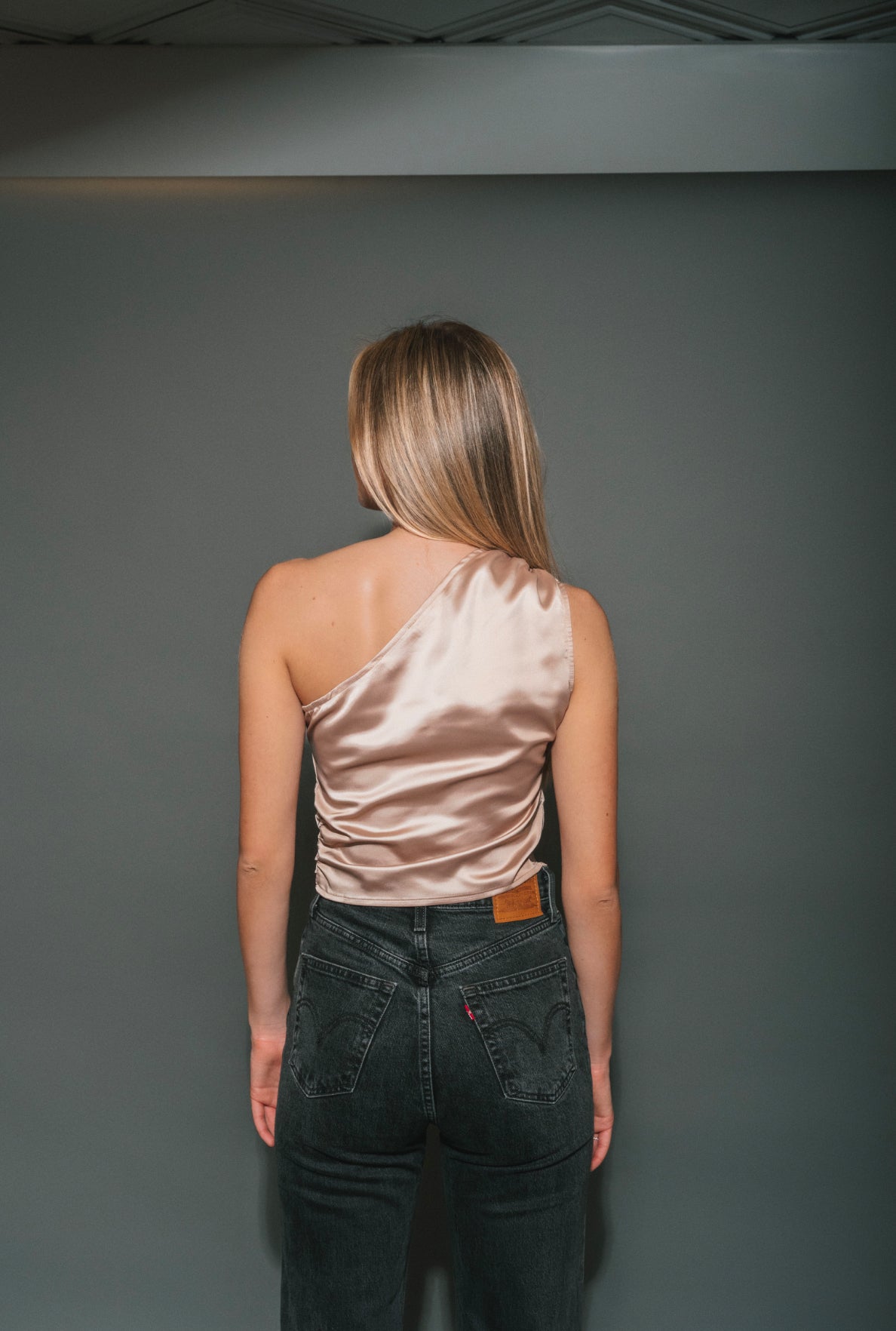 Step into elegance with the Satin One Shoulder Top in Champagne, a luxurious addition to your wardrobe. Crafted from silky satin fabric, this top radiates sophistication and grace. The soft champagne hue adds a touch of opulence, perfect for special occasions or evenings out. Featuring a flattering one-shoulder silhouette, it combines modern chic with timeless glamour. Pair it with tailored trousers or a high-waisted skirt for a refined look, or elevate casual denim for a sophisticated contrast. Embrace effortless elegance with the Satin One Shoulder Top, ensuring you shine brightly at any event.