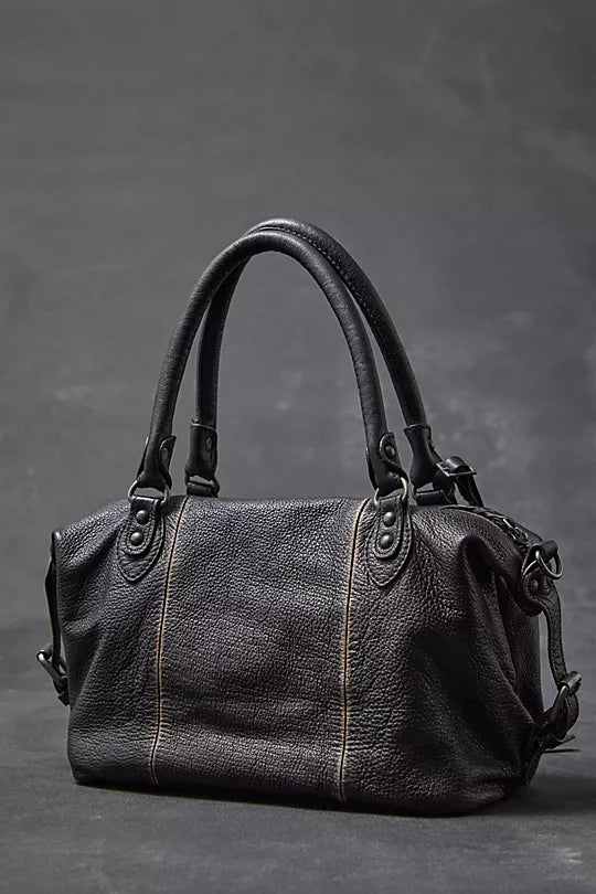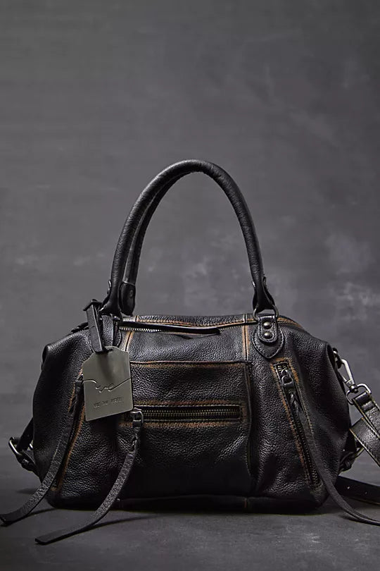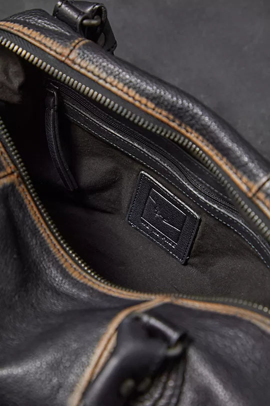 Features: Vintage-inspired leather fabrication, two carrying straps, adjustable and detachable shoulder strap, main zip entry, exterior zip pockets, interior zip pocket, leather pull tabs, logo embossed tag
