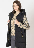 Details: Mid length vest, hooded, zipper up front & button claps, two functional front pockets with zipper closures, drawstring detail, gold hardware.
