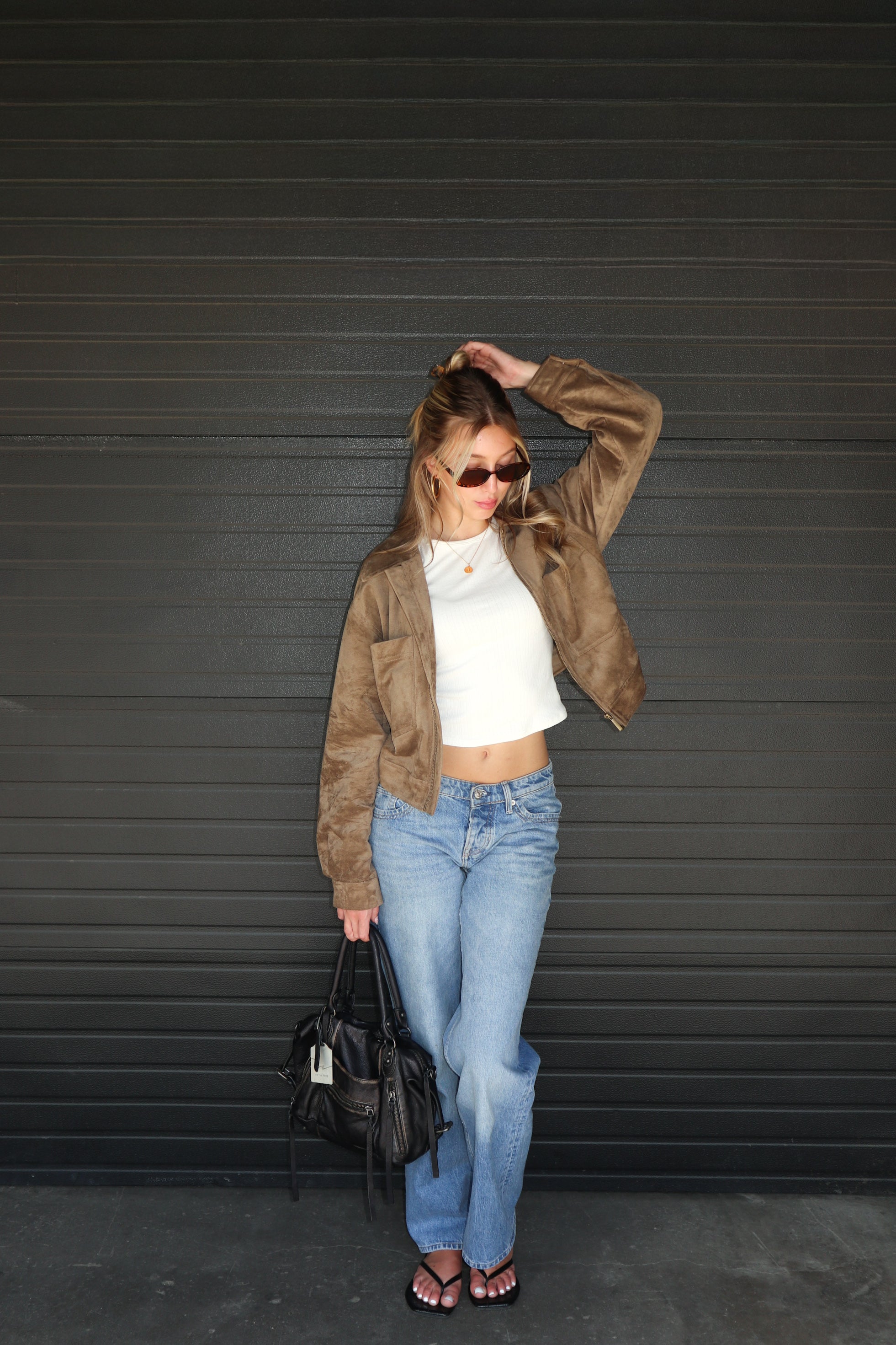 Crafted from soft faux suede with a vintage-inspired mineral wash, this jacket blends retro charm with modern ease. Its collared neckline, roomy patch pockets, and sleek zip-front design make it a versatile layer that’s as functional as it is effortlessly cool.
