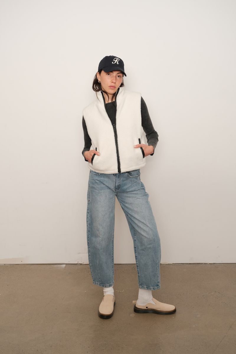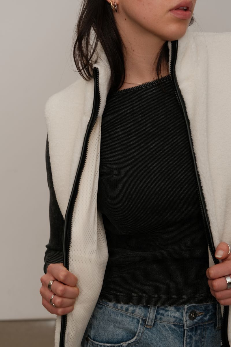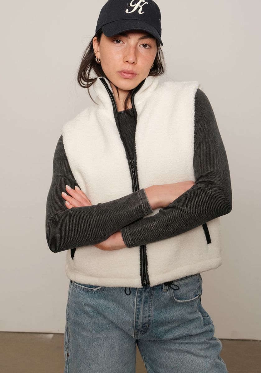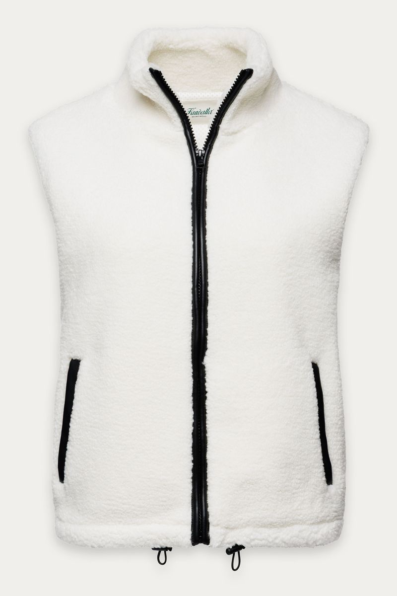 Fleece, short vest, faux leather detailing along zipper and pockets, mesh lining, adjustable drawstring bottom.