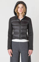 Details: Puffer vest, with fabric sleeves, hood, adjusters on hood, zipper closure, two functional pockets.
