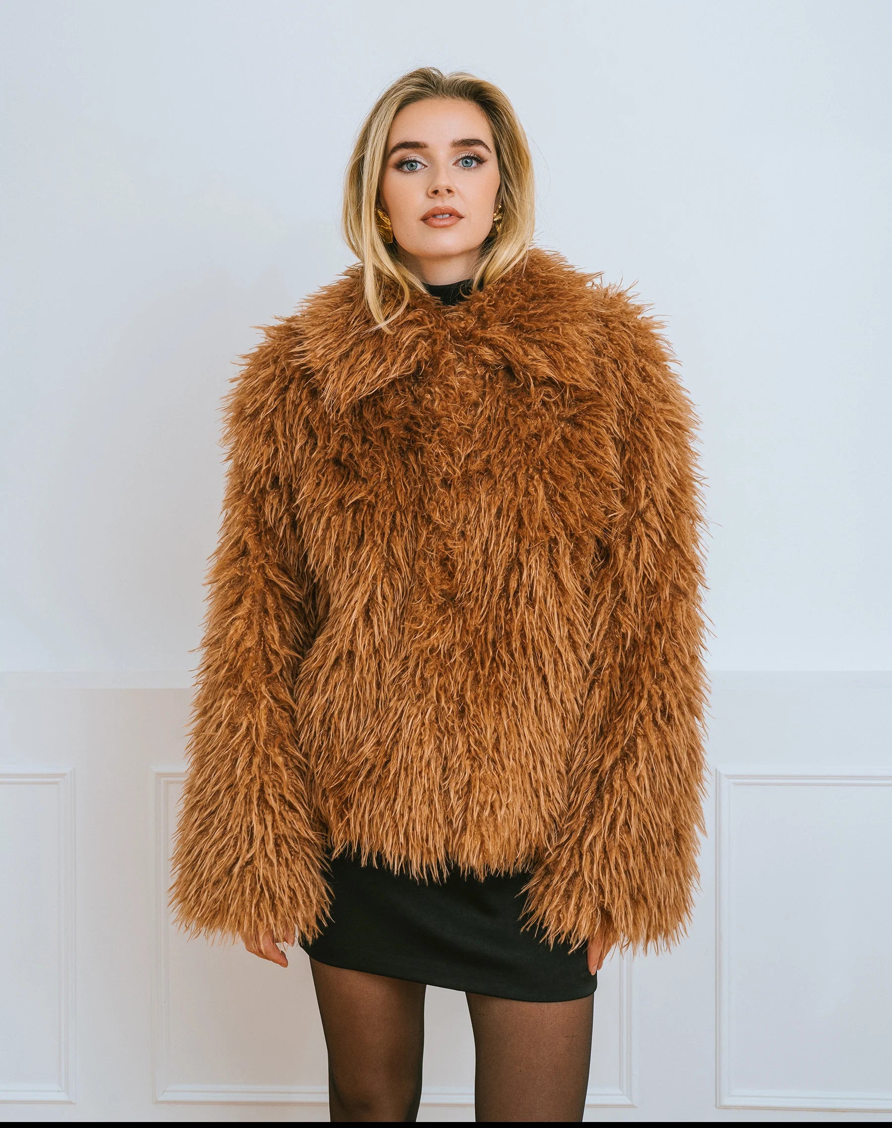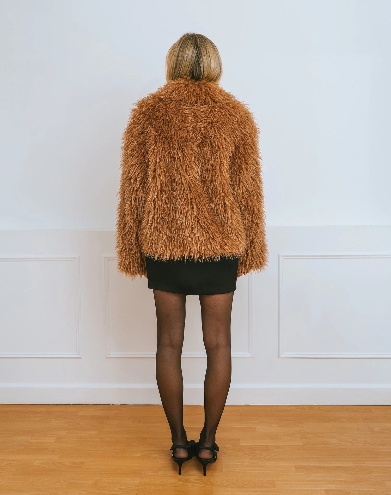 Boxy and slightly oversized, The Alfie Jacket has a big, bold collar and metallic clasps made for faux fur. Fully lined for comfort, it also features side seam pockets and a relaxed shape. Soft, plush, and designed to stand out, it’s a piece you’ll reach for all season.