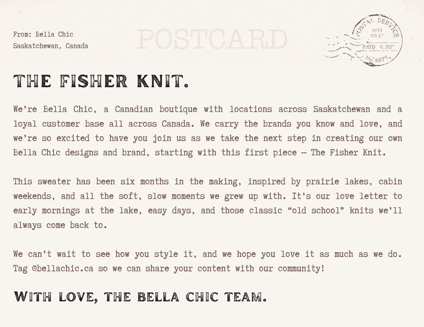 We’re so excited to have you join us as we take the next step in creating our own Bella Chic designs and brand, starting with this first piece - The Fisher Knit.