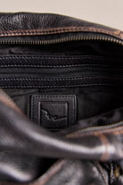 Features: Vintage-inspired leather fabrication, two carrying straps, adjustable and detachable shoulder strap, main zip entry, exterior zip pockets, interior zip pocket, leather pull tabs, logo embossed tag