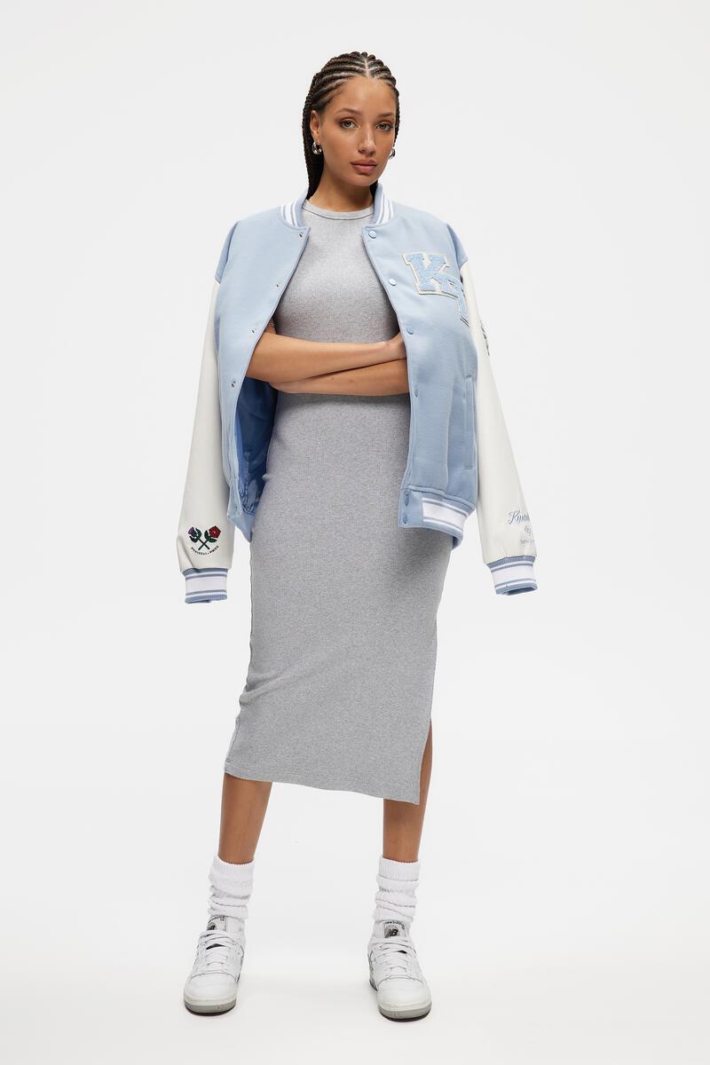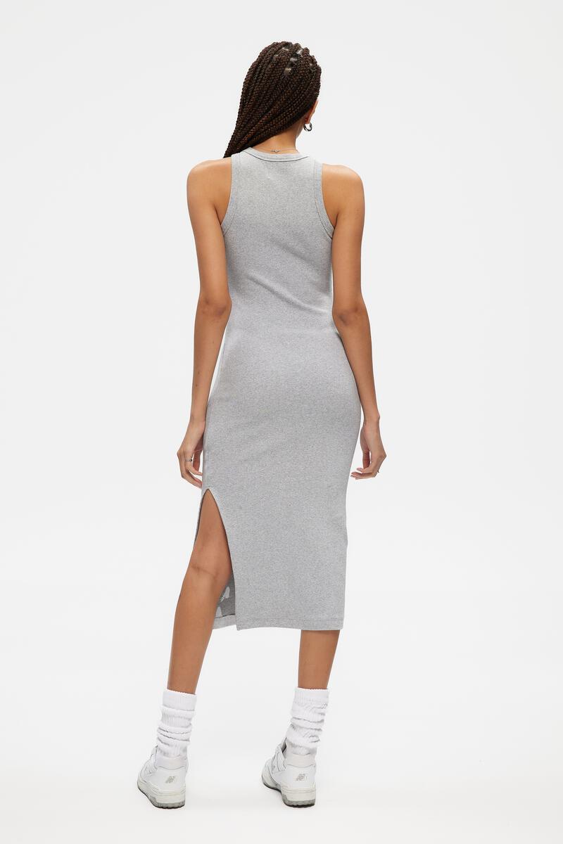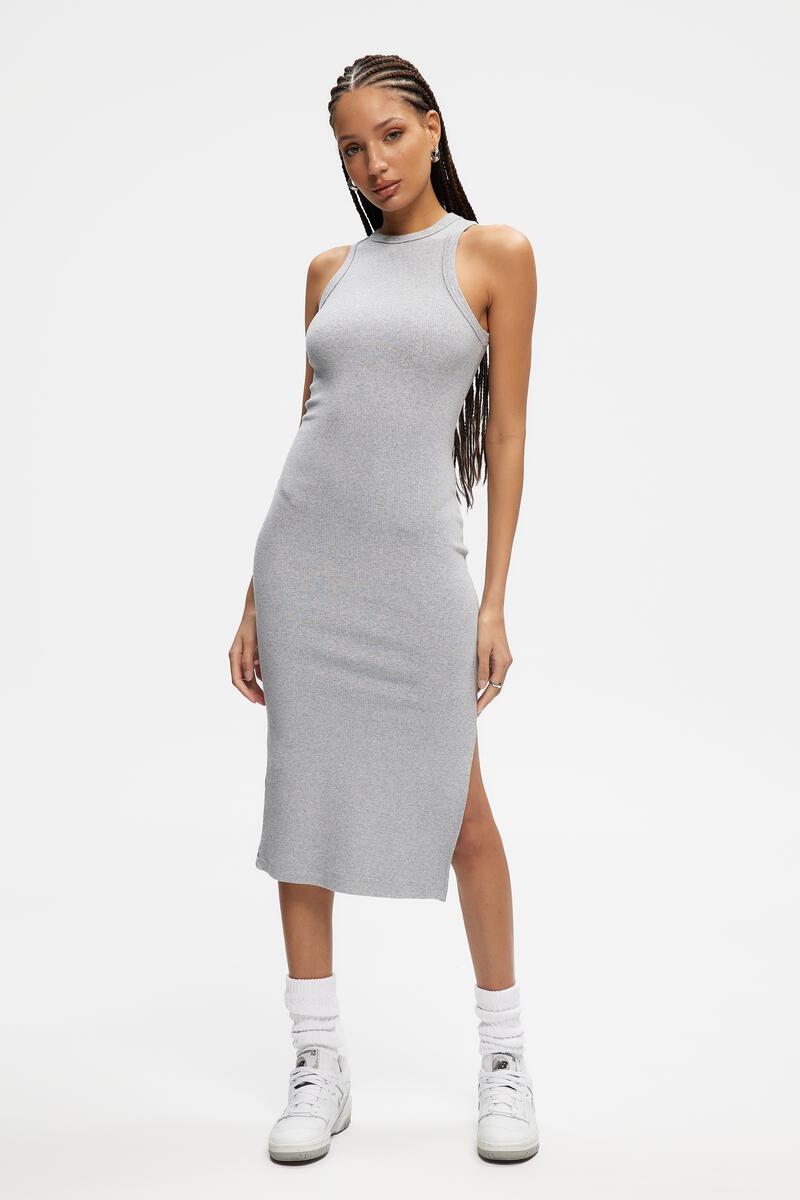 The ribbed halter dress is a basic piece that transitions from day-time casual to a night out. Made to hug & flatter, this body-con dress features a halter-neck and a fun, flirty slit at the side. Tonal stitching throughout.